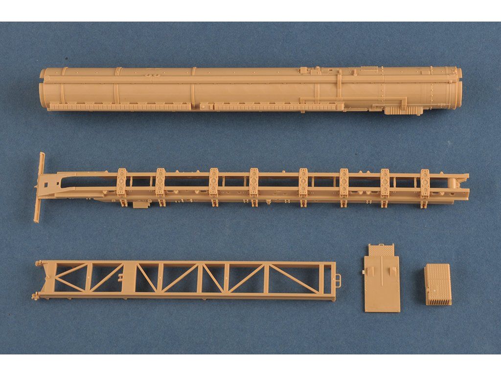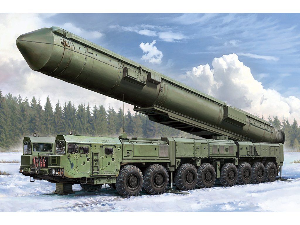 Stavebnica plastového modelu ruskej interkontinentálnej balistickej rakety s odpaľovačom.