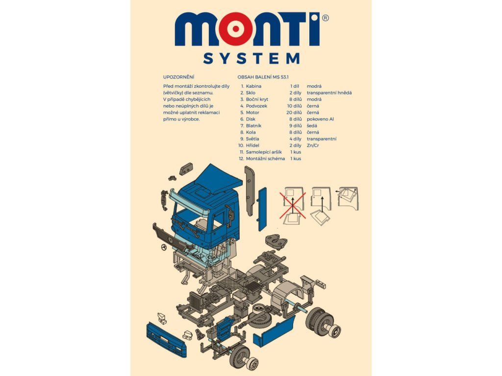 Jednotlivé diely sú lisované z farebného plastu, takže nemusíte nič farbiť. Naviac sú niektoré dieliky pochrómované a v nových Monti Systém stavebniciach majú niektoré modely pre ešte realistickejší vzhľad gumové pneumatiky kolies. V každom balení tiež nájdete samolepky, ktorými si zložený model môžete polepiť.