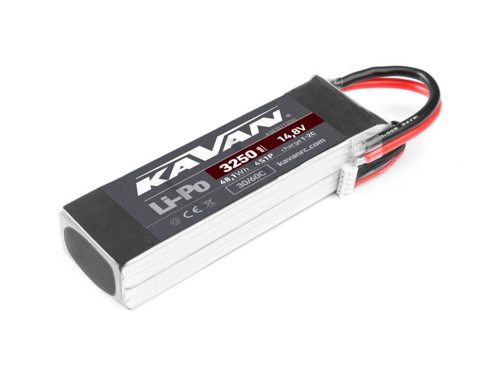 LiPo akumulátorová sada KAVAN s nabíjením do 2C a vybíjením 30/60C. Čtyřčlánek 4s1p 14,8V 3250 mAh, rozměry: 136x42,5x27mm, hmotnost 317g, servisní konektor JST-XH.