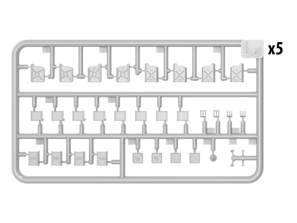 Stavebnica plastového modelu sady kanistrov spojeneckých vojsk z obdobia druhej svetovej vojny.