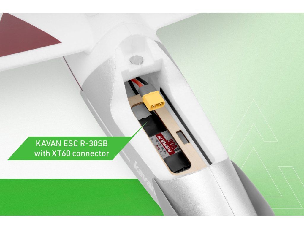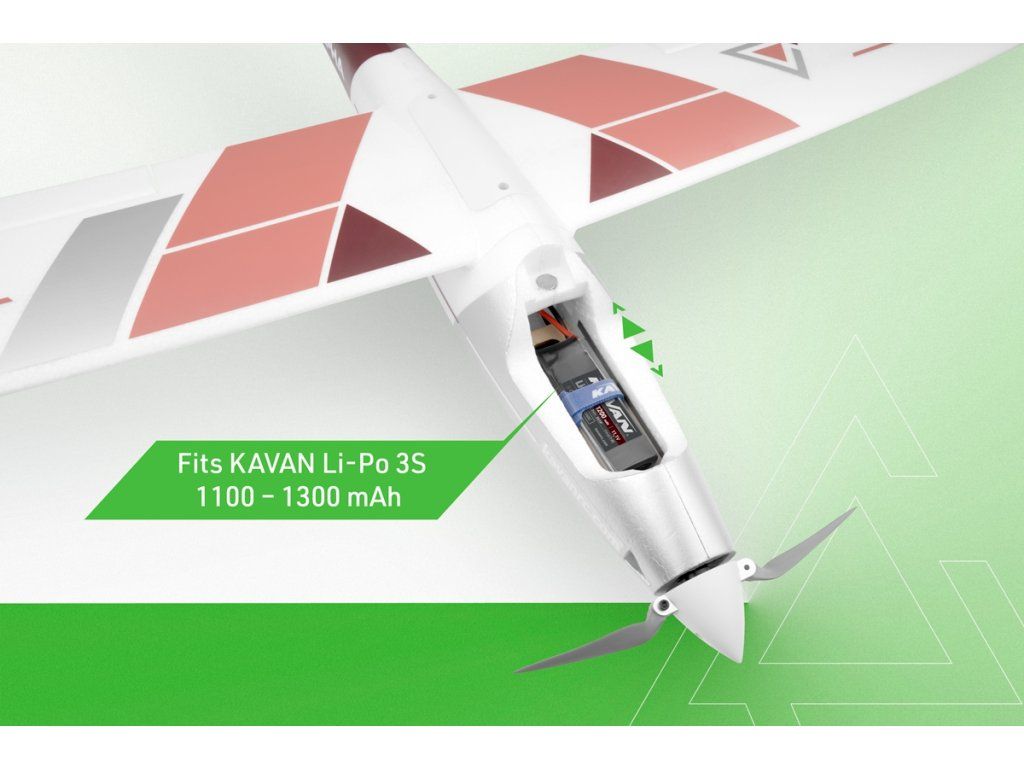 Obsah balení: trup vylisovaný z EPO s namontovaným střídavým motorem, sklopnou vrtulí 8,5x6", regulátorem otáček KAVAN 30A a 2 servy KAVAN GO-09, křídlo vymačkané z EPO s instalovanými 2 servy KAVAN GO-09 a LED spojku křídla a podrobný návod na stavbu a létání.