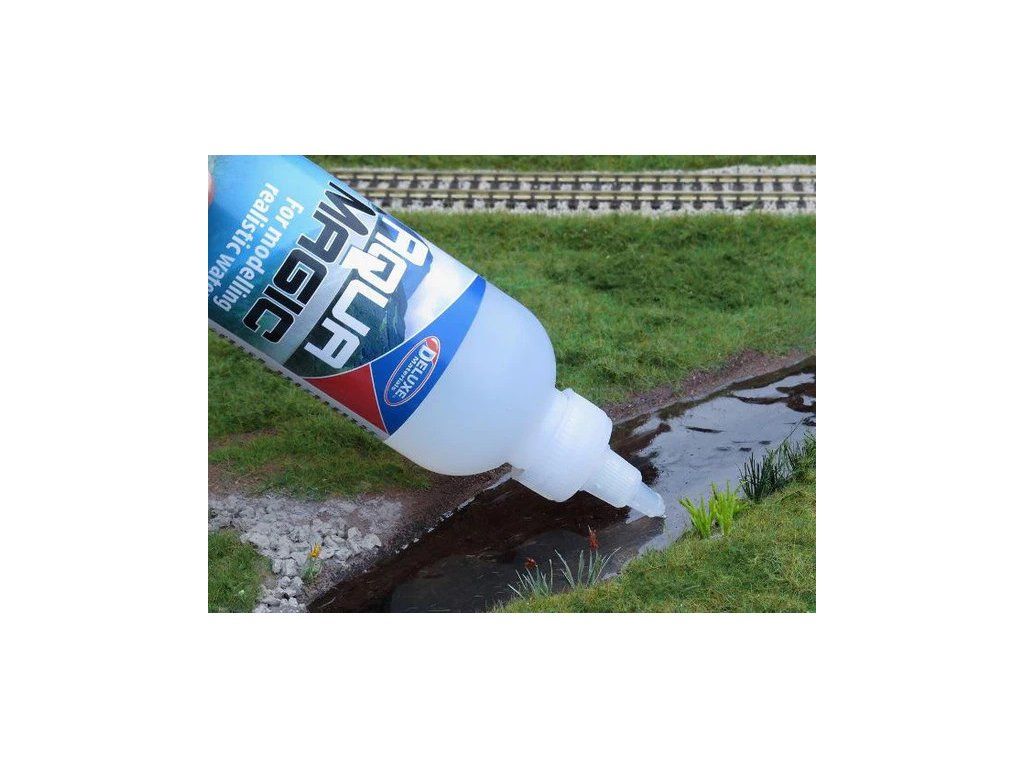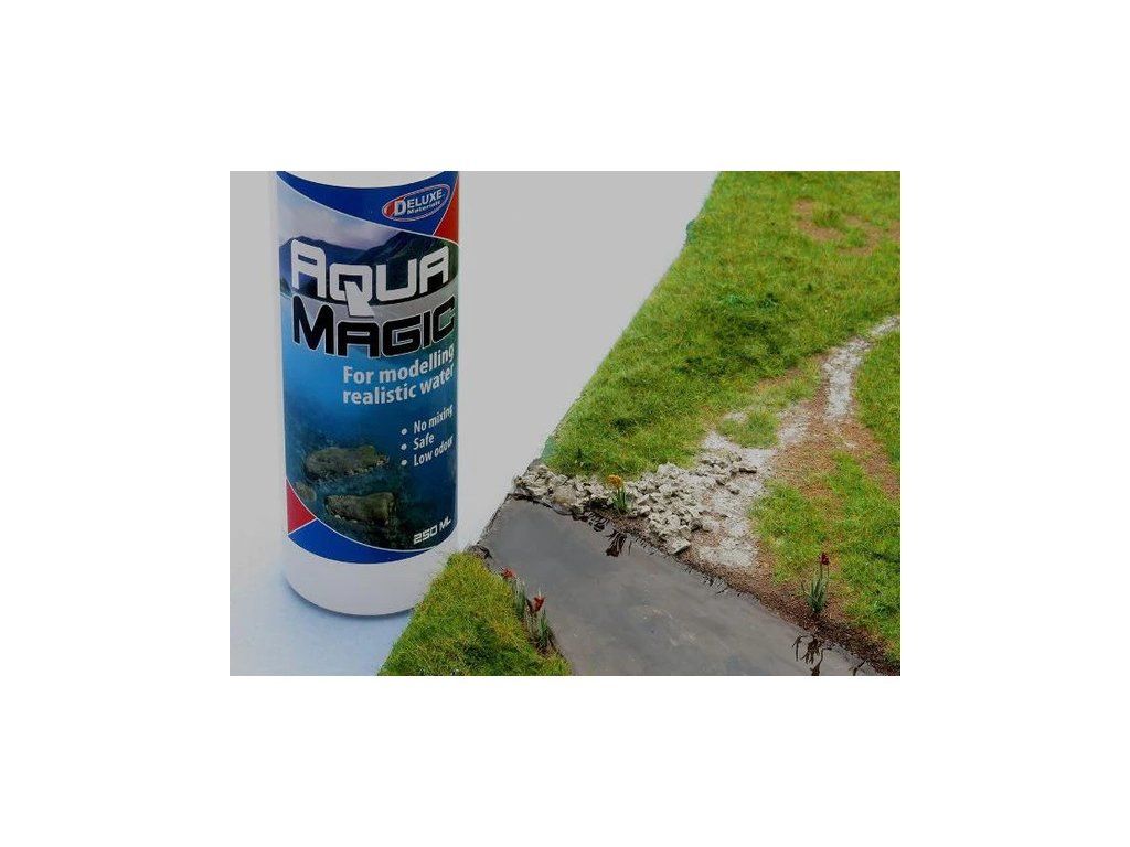Aqua Magic je tekutina gelové konzistence k vytvoření realistické vodní hladiny (jezera, řeky, louže, bláta) v modelovém kolejišti nebo diorámu. Je bez zápachu, nemění odstín, nebledne.