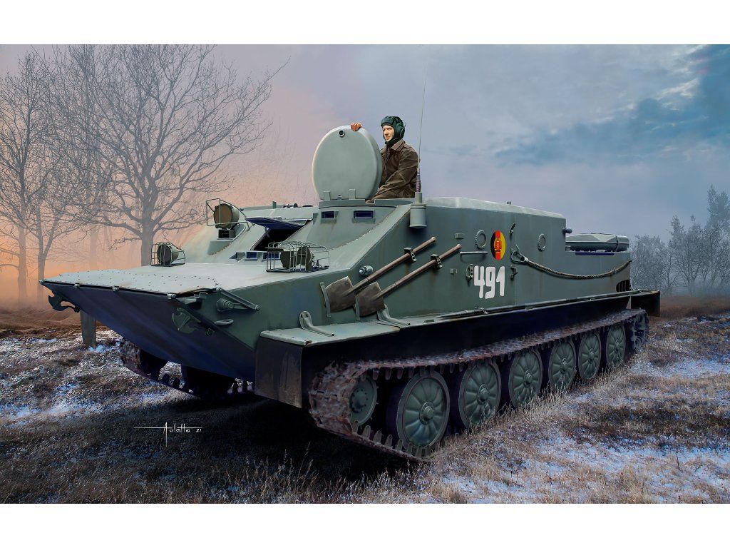 Stavebnica plastového modelu sovietskeho obojživelného pásového transportéra.
