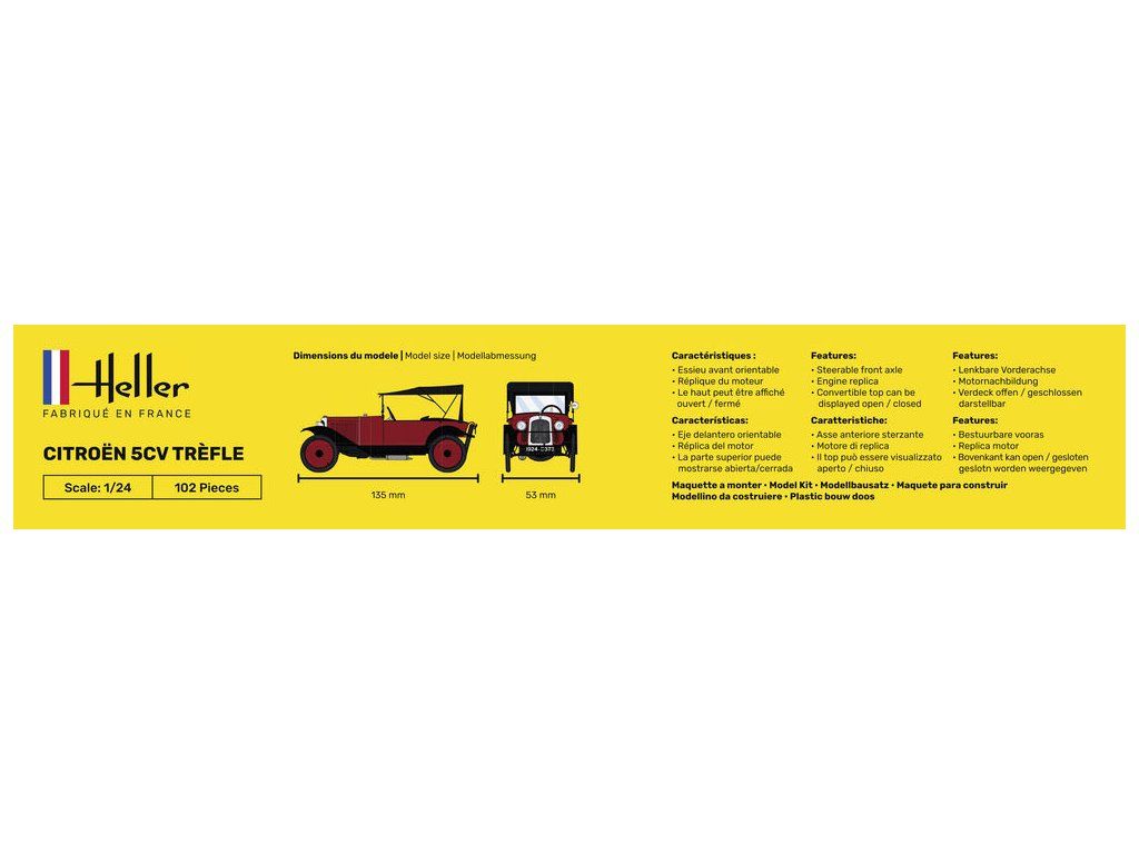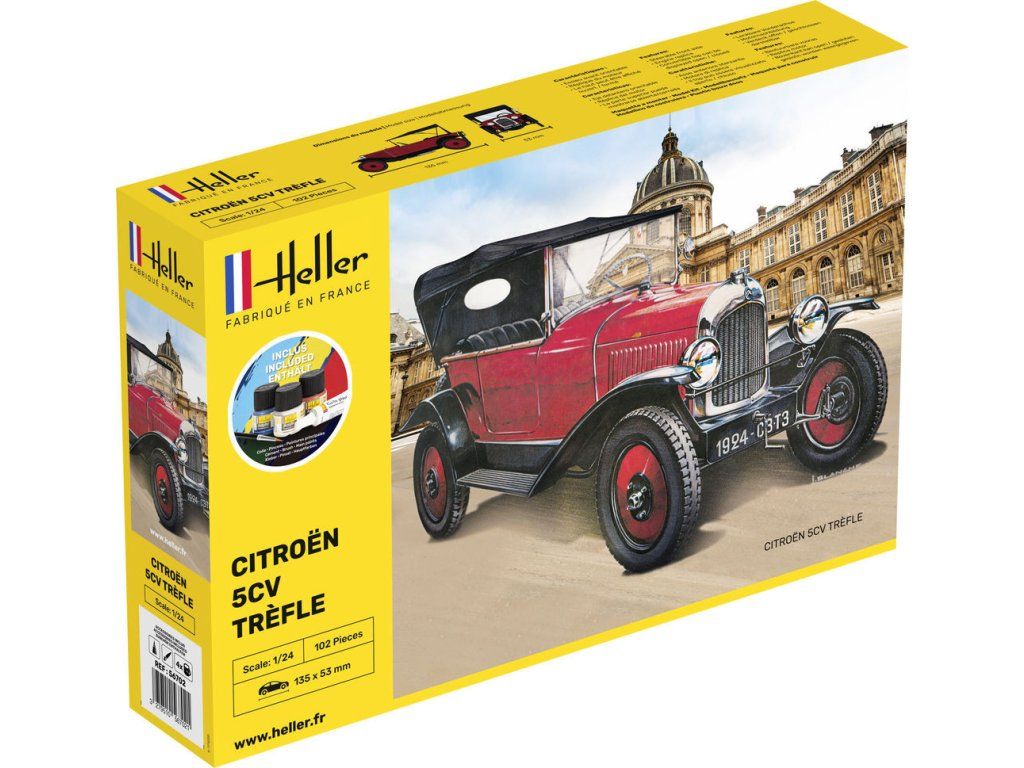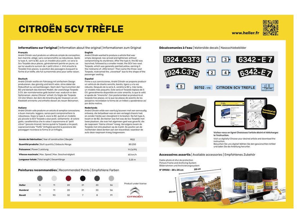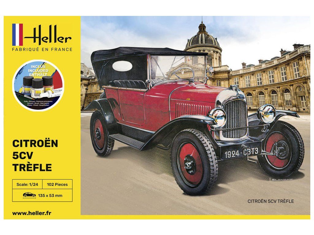Stavebnice plastového modelu autoveterána. André Citroën chtěl vyrobit vůz, který byl jednoduše navržen, levný a odlehčený, aniž by to ohrozilo jeho robustnost. Po uvedení typu A na trh byl uveden model B2, následovaný menším modelem, dvoumístným 5CV, které bylo nabarveno žlutě a získalo si přezdívku „malý citron“. Potom přišlo třímístné, které bylo díky tvaru sezení pro cestující přezdíváno „čtyřlístek“.