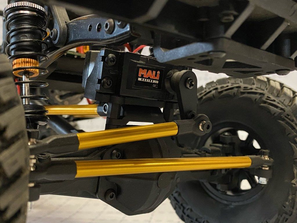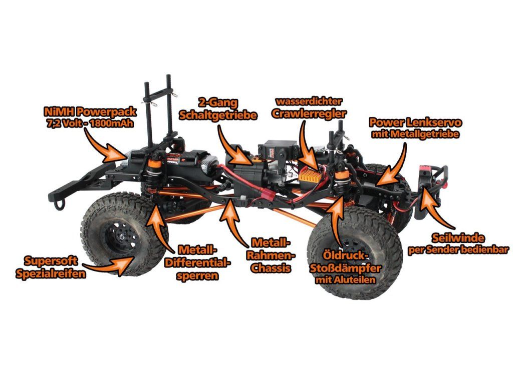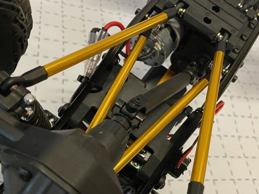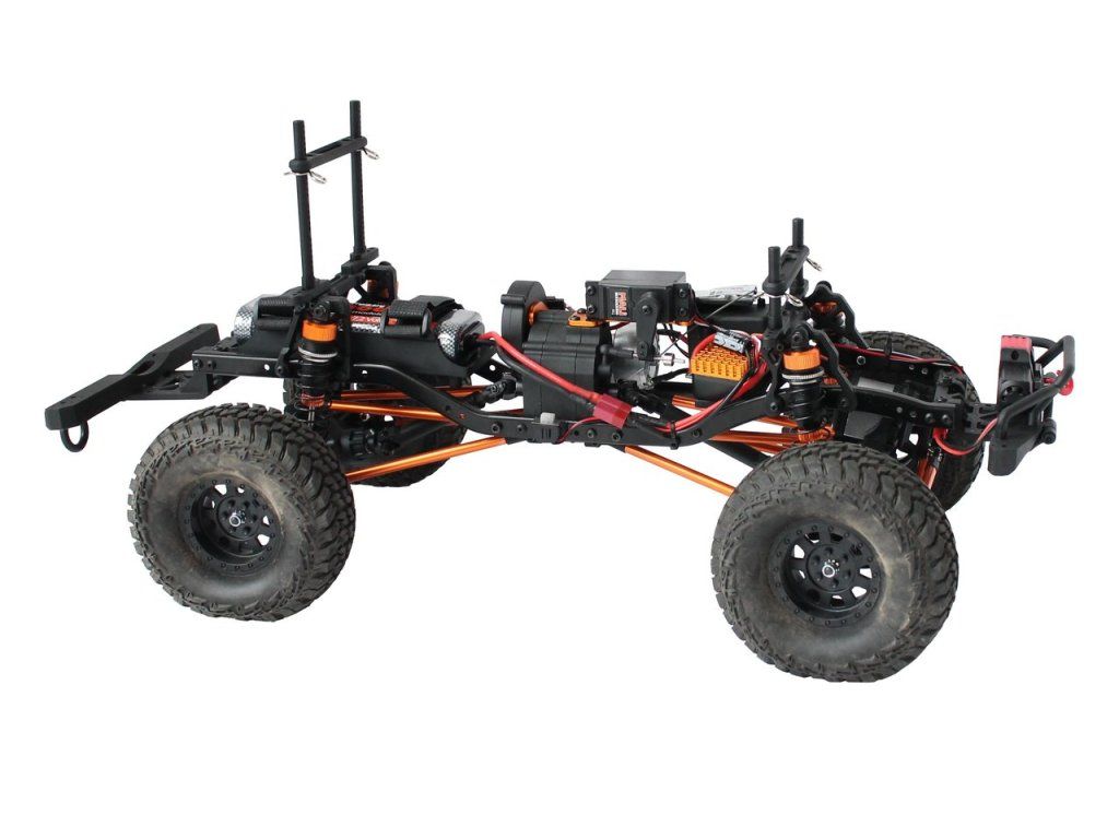 Rám šasi tvoria klasické dva kovové pozdĺžniky s plastovými priečnikmi a lôžkami pre upevnenie pohonu, serva riadenia a batérie. Klasická osvedčená konštrukcia zabezpečuje dostatočnú tuhosť a zároveň veľký výkyv náprav pri zdolávaní pekážok. Olejové tlmiče majú matice pre nastavenie tuhosti pružín. Servo riadenia je dostatočne silné a má kovové prevody. Výrobca deklaruje vodeodolnosť voči striekajúcej vode. Diferenciály náprav sú trvalo uzamknuté, stredová prevodovka umožňuje pomocou serva nastaviť jeden z dvoch prevodových pomerov a zvoliť tak rýchlosť modelu na rovine, alebo vysoký krútiaci moment v ťažkom teréne. LED svetlá (vrátane blinkrov a brzdových) sú nainštalované a diaľkovo ovládané.