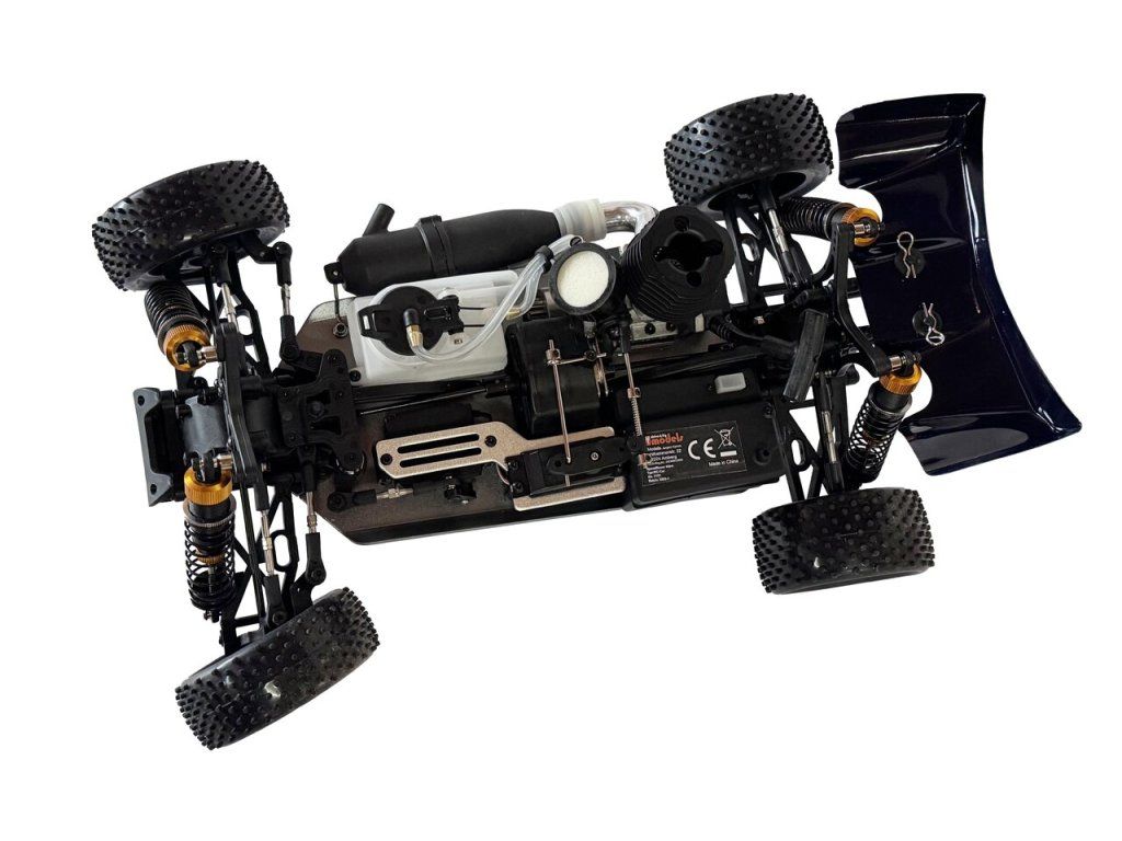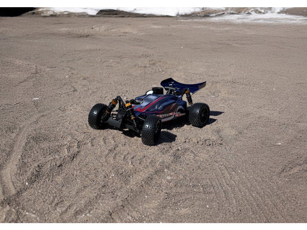 RC model buggy s nitro motorem o objemu 2,74cm3.Hliníkový podvozek zajišťuje stabilitu za jízdy a široká škála možností nastavení včetně pravých/levých závitových tyčí pro rozchod a odklon umožňuje optimální výkon na závodní trati i v terénu. Vysoce kvalitní díly, jako jsou kovové diferenciály a CVD hnací hřídele (vpředu), zajišťují odolnost a působivý výkon.