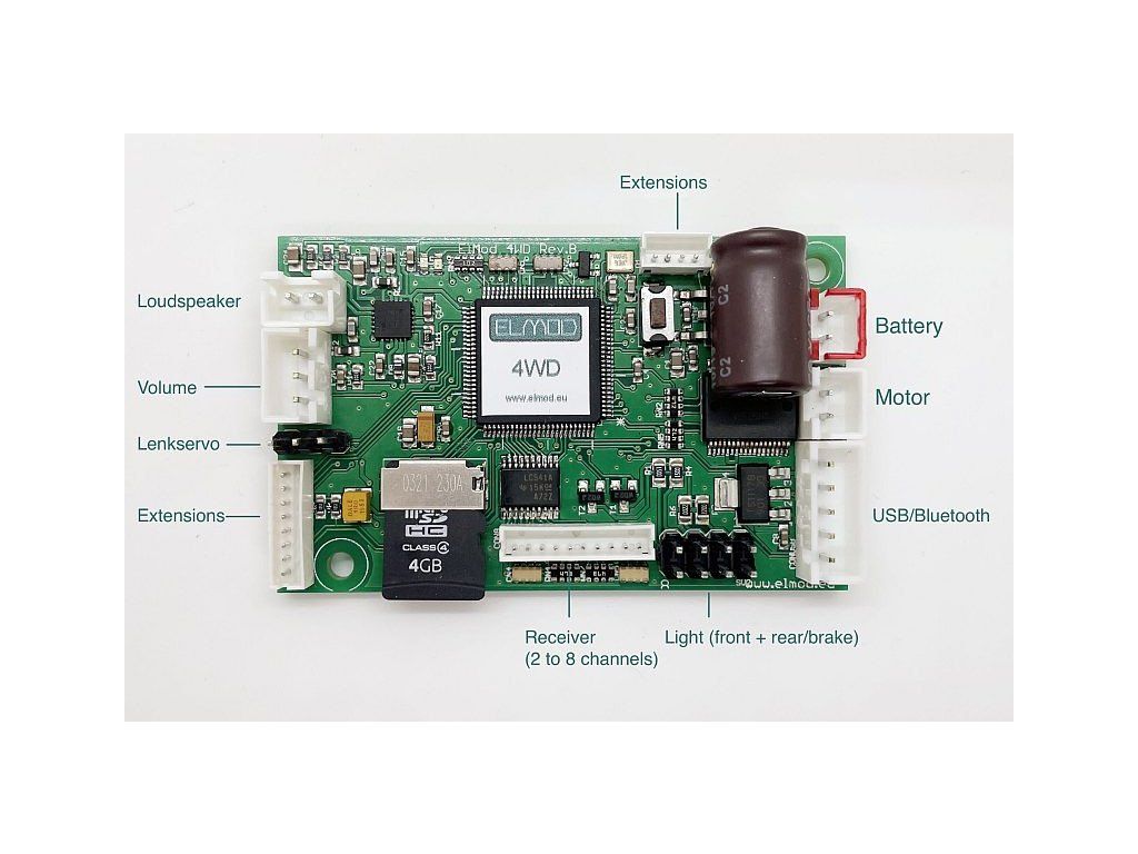 ElMod 4WD je moderná miniatúrna centrálna jednotka pre všetky RC modely vozidiel s jedným hnacím motorom a servoriadením prednej nápravy.