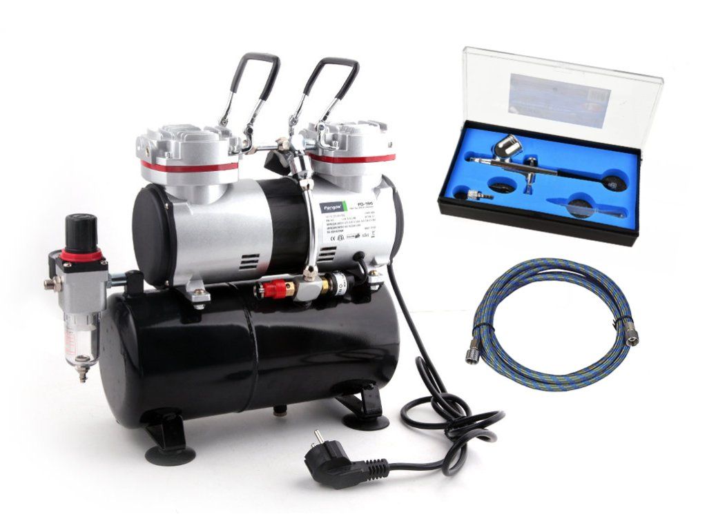 Jednopístový bezolejový kompresor s tlakovou nádobou a regulátorem výstupního tlaku, filtrem a manometrem (tlakoměrem). Po dosažení požadovaného tlaku se sám vypne. Opět se zapne, když tlak klesne pod nastavenou úroveň. Vhodný pro airbrush s tryskami od 0,2 do 1 mm.
