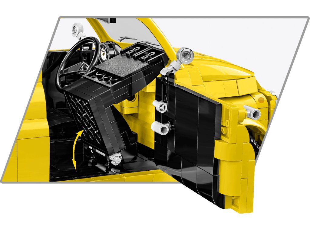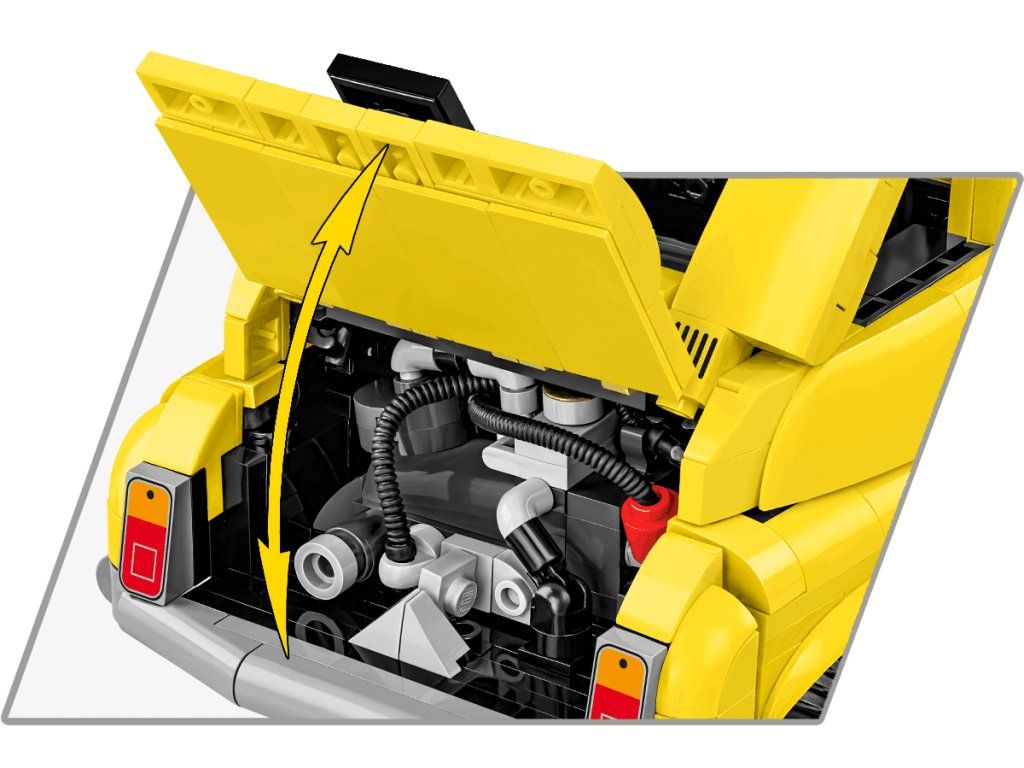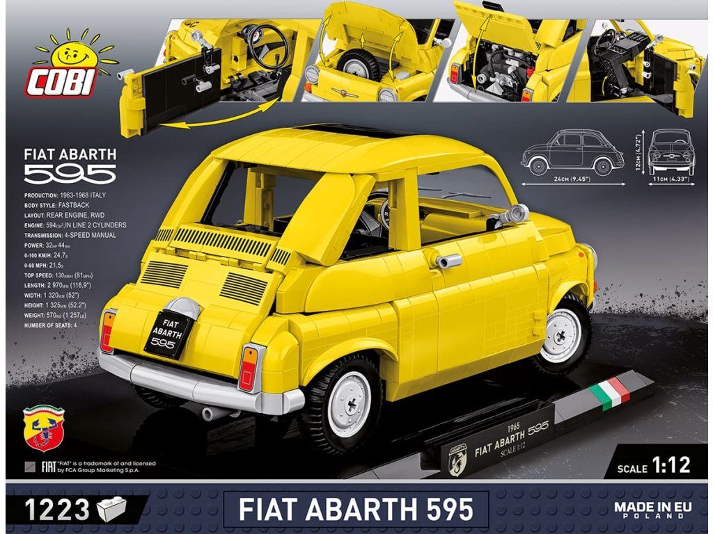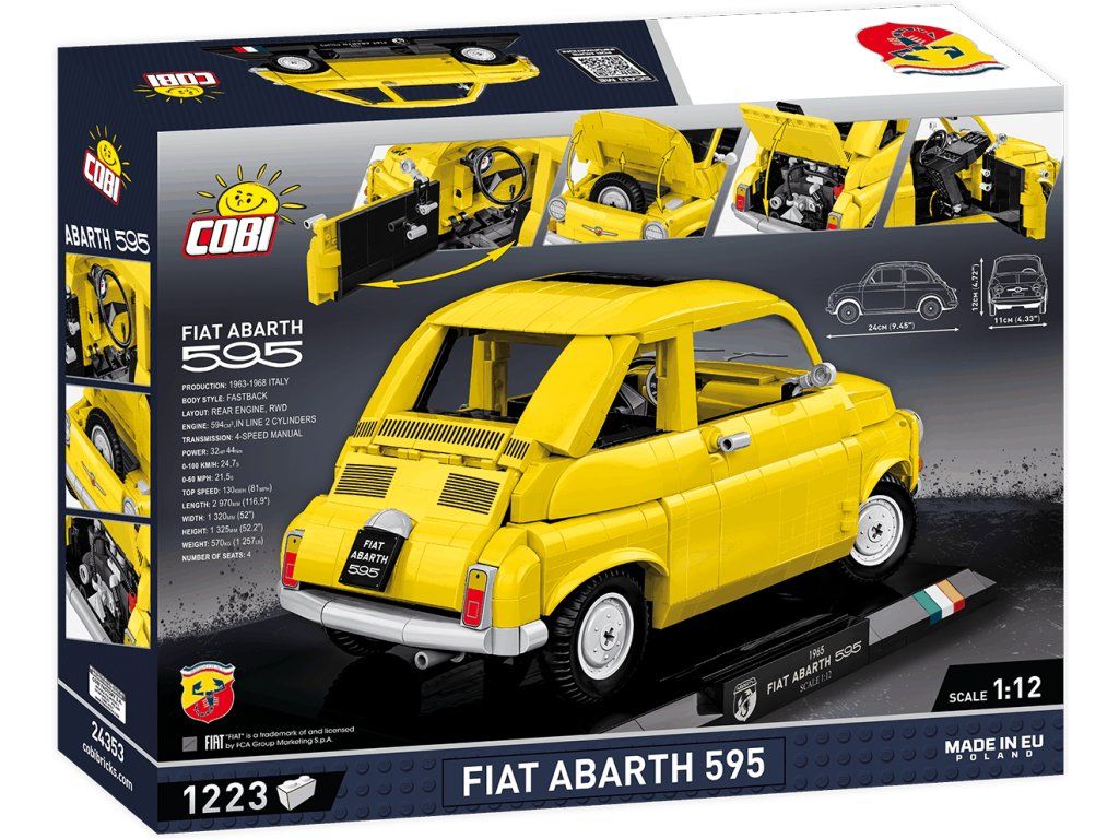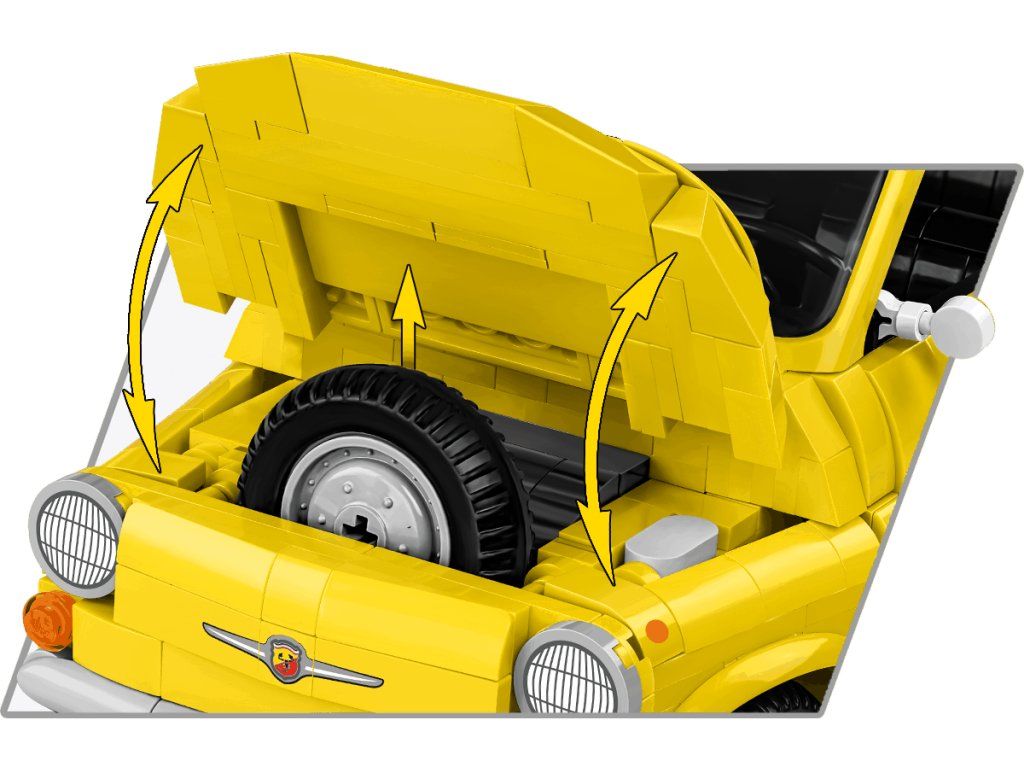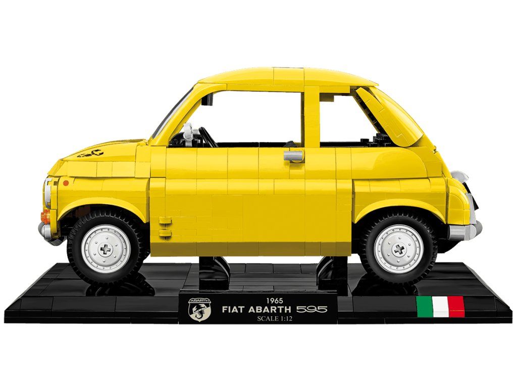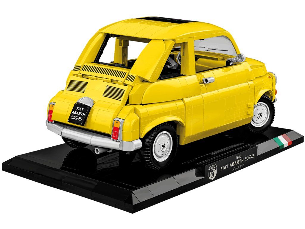 Stavebnice z kostek italského rychlého a obratného vozu Fiat ve sportovní úpravě ABARTH z roku 1969. Autíčko je ve speciální žluté barvě k 20. výročí značky. Prosklení je vyrobeno z transparentního plastu