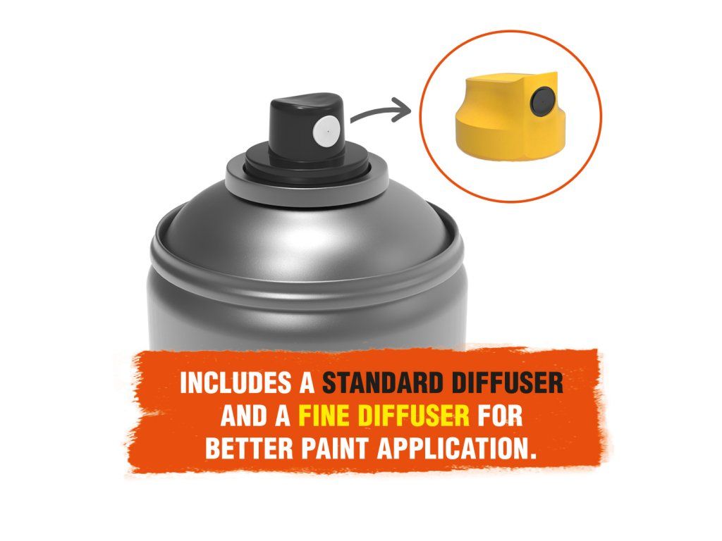 Barevný vrch plechovky zobrazuje přesný odstín spreje. Sprej se dodává se 2 různými tryskami.