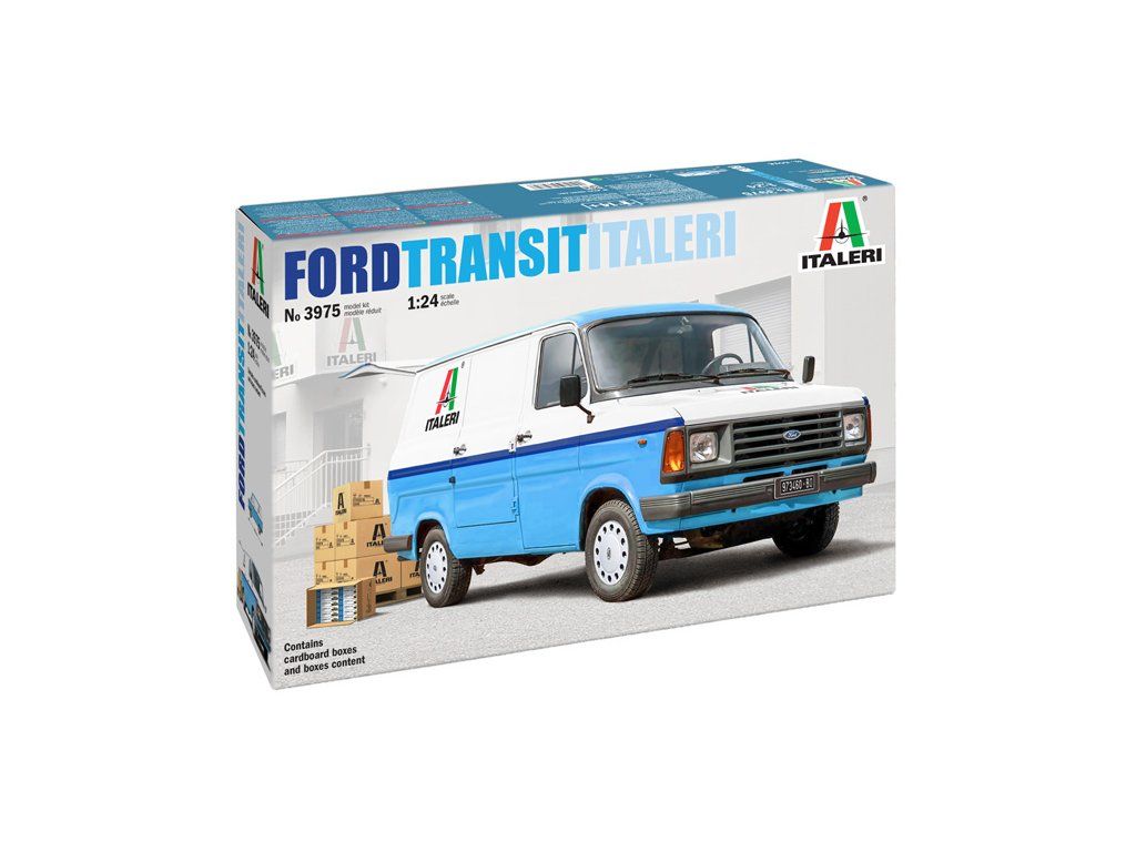 Stavebnice plastikového modelu lehkého nákladního auta značky Ford s logem Italeri. Stavebnice obsahuje také kartonové krabice s modely.