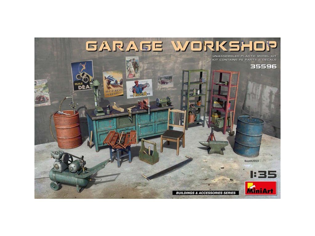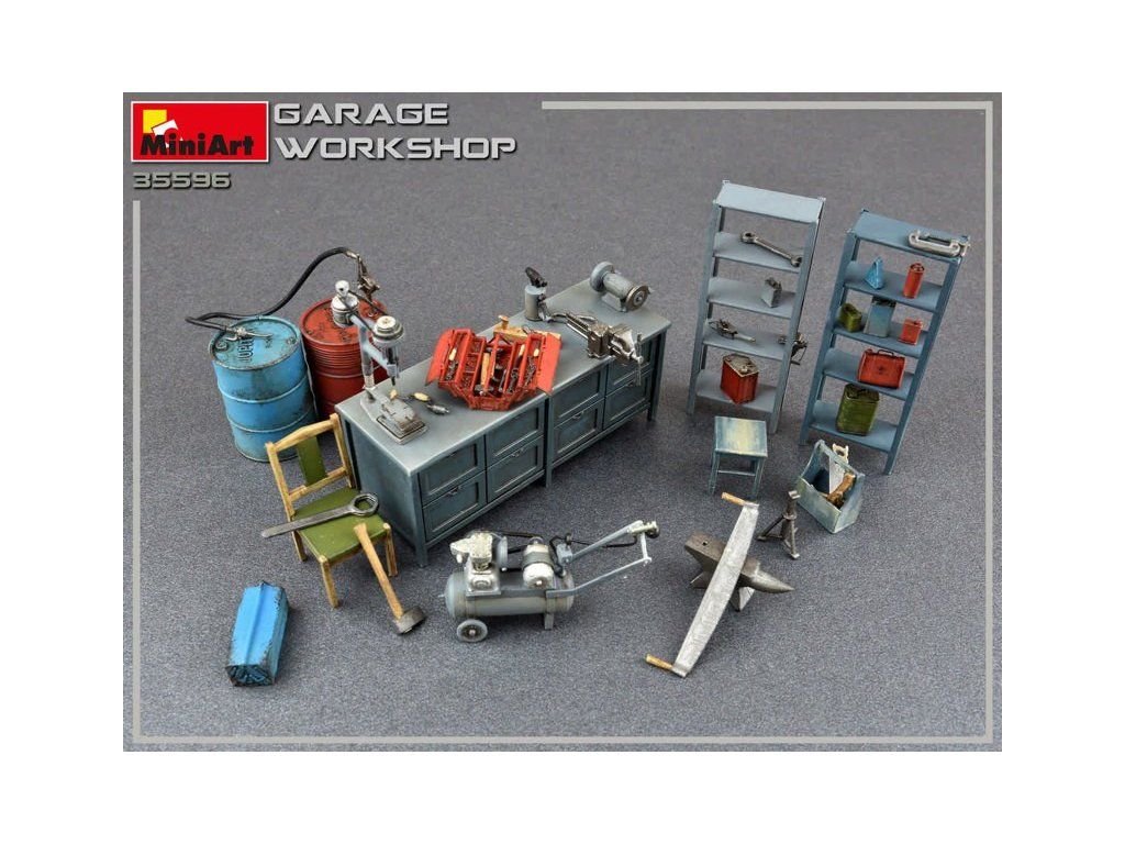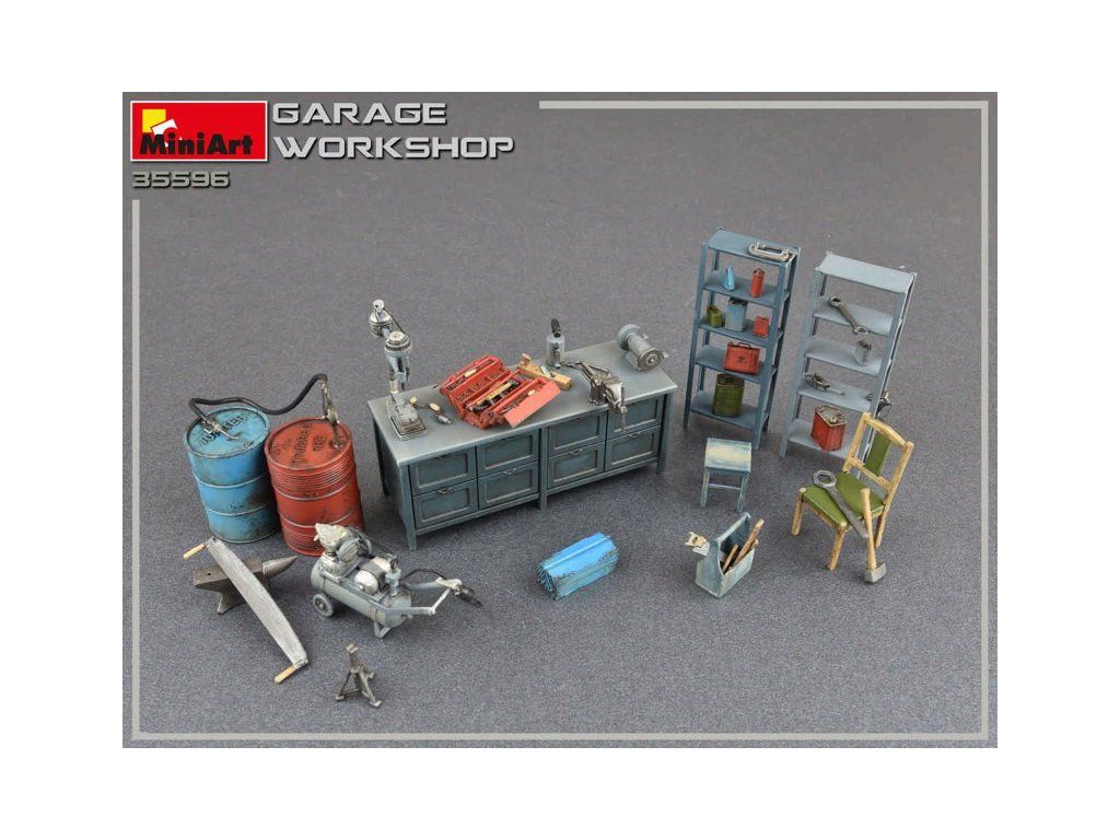 Stavebnice plastikového modelu vybavení garáže/dílny.Stavebnice obsahuje také kovové fotoleptané díly