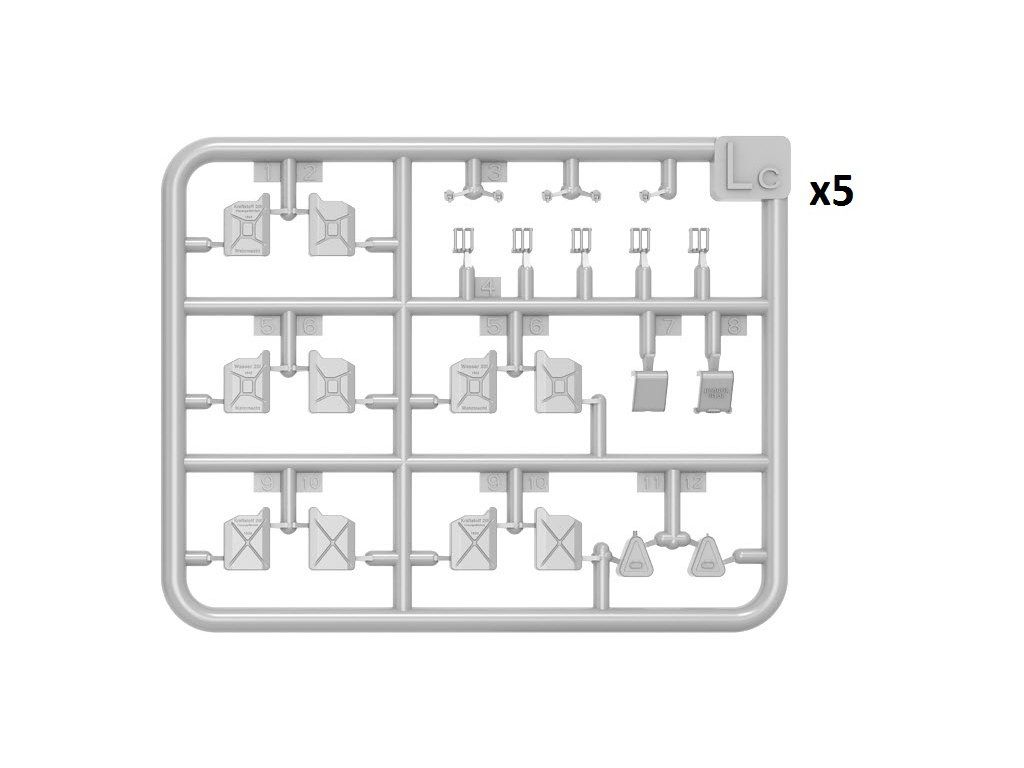 Stavebnica plastového modelu sady nemeckých kanistrov z obdobia 2. svetovej vojny. Stavebnica umožňuje postaviť 28ks kanistrov.