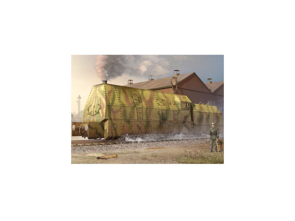 Plastová stavebnica modelu nemeckej pancierovanej lokomotívy z obdobia 2. sv. vojny, ktorá ťahala obrnené vlaky.