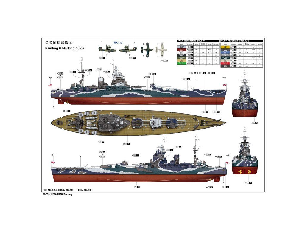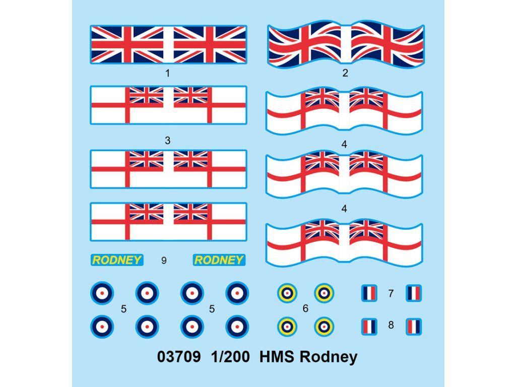 Stavebnica plastového modelu britskej bojovej lode z obdobia 2. svetovej vojny. Kýl HMS RODNEY bol položený v lodenici Cammell Laird v Birkenheadone 28. decembra 1922, a spustená na vodu bola 17. decembra 1925. Počas nórskeho ťaženia v apríli 1940 RODNEY zasiahla 500 kg bomba zhodená nemeckým bombardérom, bola však opravená a pokračovala v službe. Na konci roku 1940 RODNEY hľadal, ale minul nemeckú vreckovú bitevnú loď ADMIRAL SCHEER. 27. mája 1941 sa RODNEY zúčastnil akcie, ktorá vyústila do potopenia nemeckej bitevnej lode BISMARCK a vypálila takmer 380 nábojov 16-palcových granátov. Od konca roku 1941 do roku 1942 bol RODNEY nasadený do Stredozemného mora ako sprievod konvoja so sesterskou loďou NELSON. Po invázii na Sicílii v roku 1943 bol RODNEY prvou britskou bitevnou loďou, ktorá vstúpila na Maltu od roku 1940, a bola aktívna v Salernolande v septembri 1943. Počas vylodenia v Normandii 6. júna 1944 bola RODNEY v zálohe, ale od 7. júna do 9. júla 1944 vypálila do predmostia vylodenia viac ako 500 16-palcových nábojov a mnohými stovkami 6-palcových a 4,7-palcových nábojov. Po skončení vojny v roku 1945 bola RODNEY prevedená do rezervy a v roku 1948 predaná do šrotu.