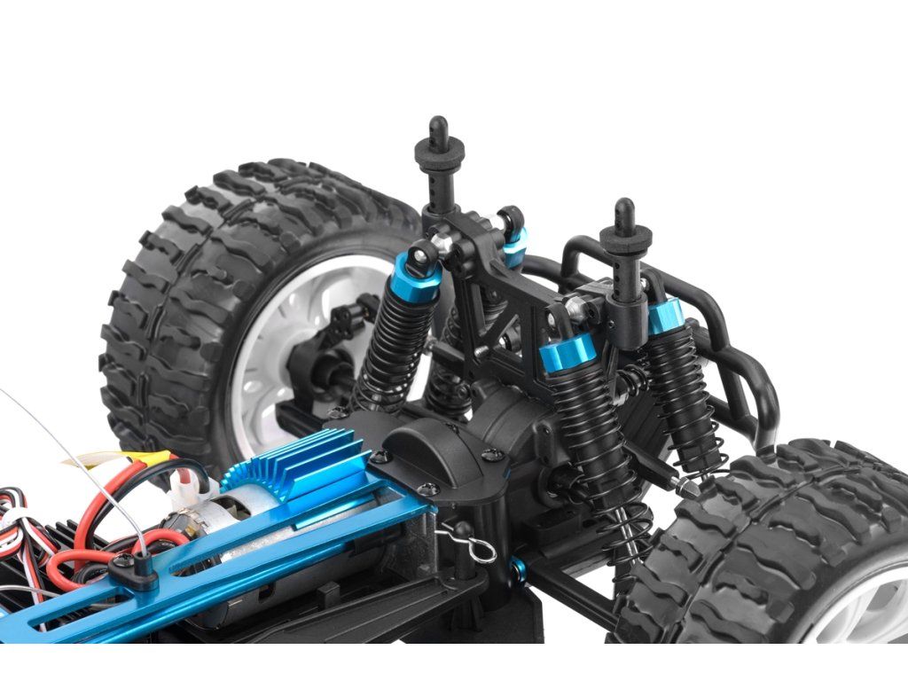 Model monster trucku v mierke 1:10 s pohonom všetkých kolies 4x4, poháňaný jednosmerným motorom vrátane. RC volantová súprava 2,4 GHz. Vodeodolný 40A regulátor, prijímač a 6kg servo. Bez pohonného akumulátora a nabíjačky. Zelená karoséria.