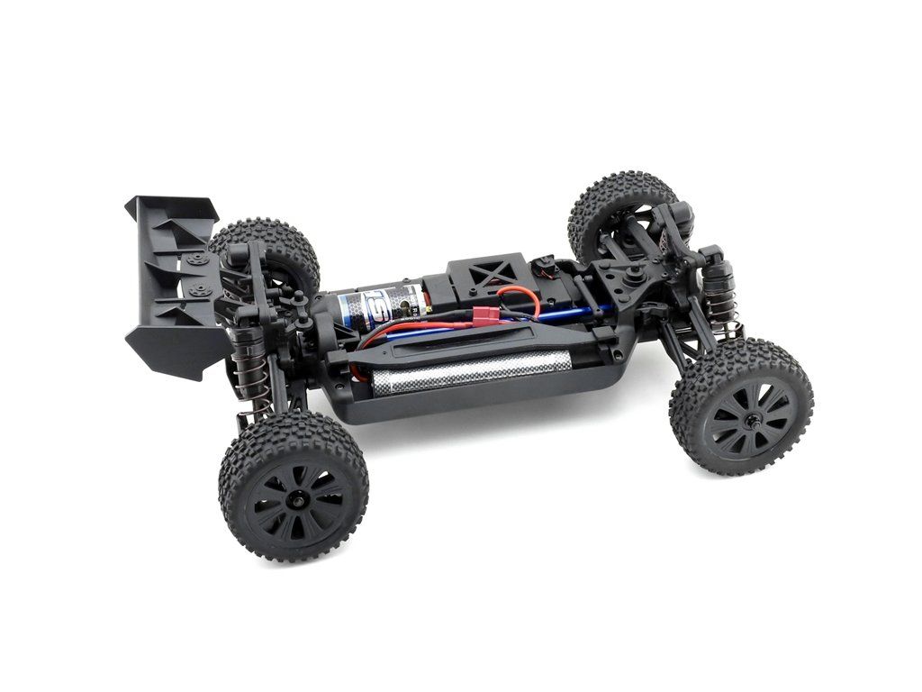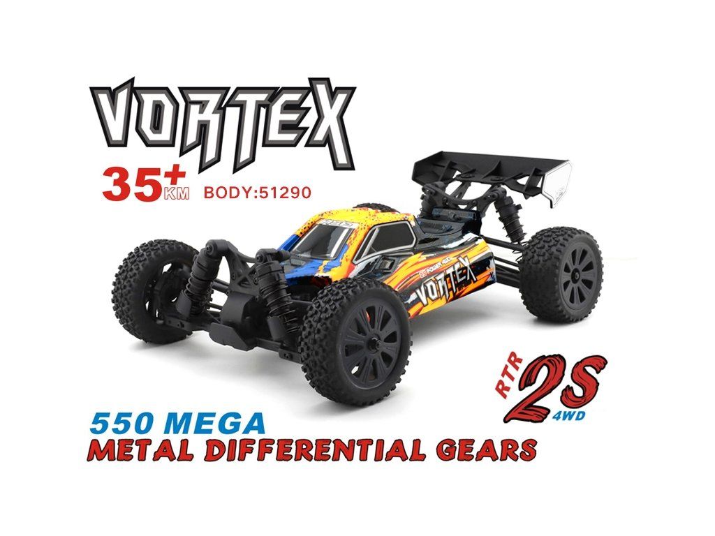 Model buggy v mierke 1:10 s pohonom všetkých kolies 4x4, poháňaný jednosmerným motorom. RC volantová súprava 2,4 GHz. Vodotesný 60A regulátor, prijímač a 15 kg servo. Bez pohonného akumulátora a nabíjačky. Oranžová karoséria.