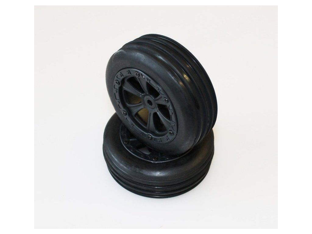 Kompletné predné kolesá pre RC model terénneho auta typu buggy, a truggy s pohonom zadnej nápravy 2WD. Pneumatiky sú prilepené, vnútri sú molitanové vložky.