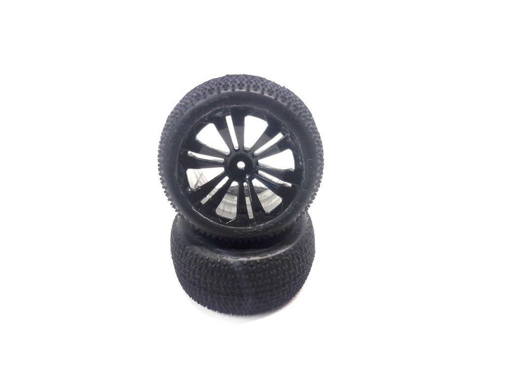 Kompletné predné kolesá pre RC model terénneho auta typu buggy, a truggy s pohonom zadnej nápravy 2WD, alebo s pohonom všetkých kolies 4WD. Pneumatiky sú prilepené, vnútri sú molitanové vložky.