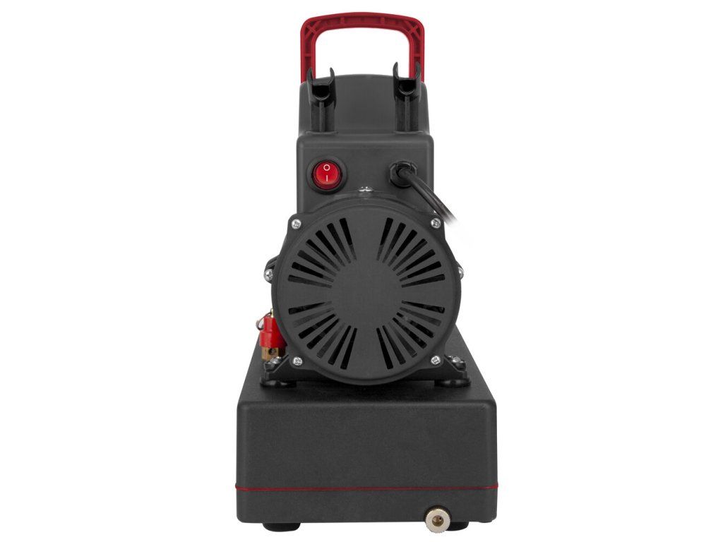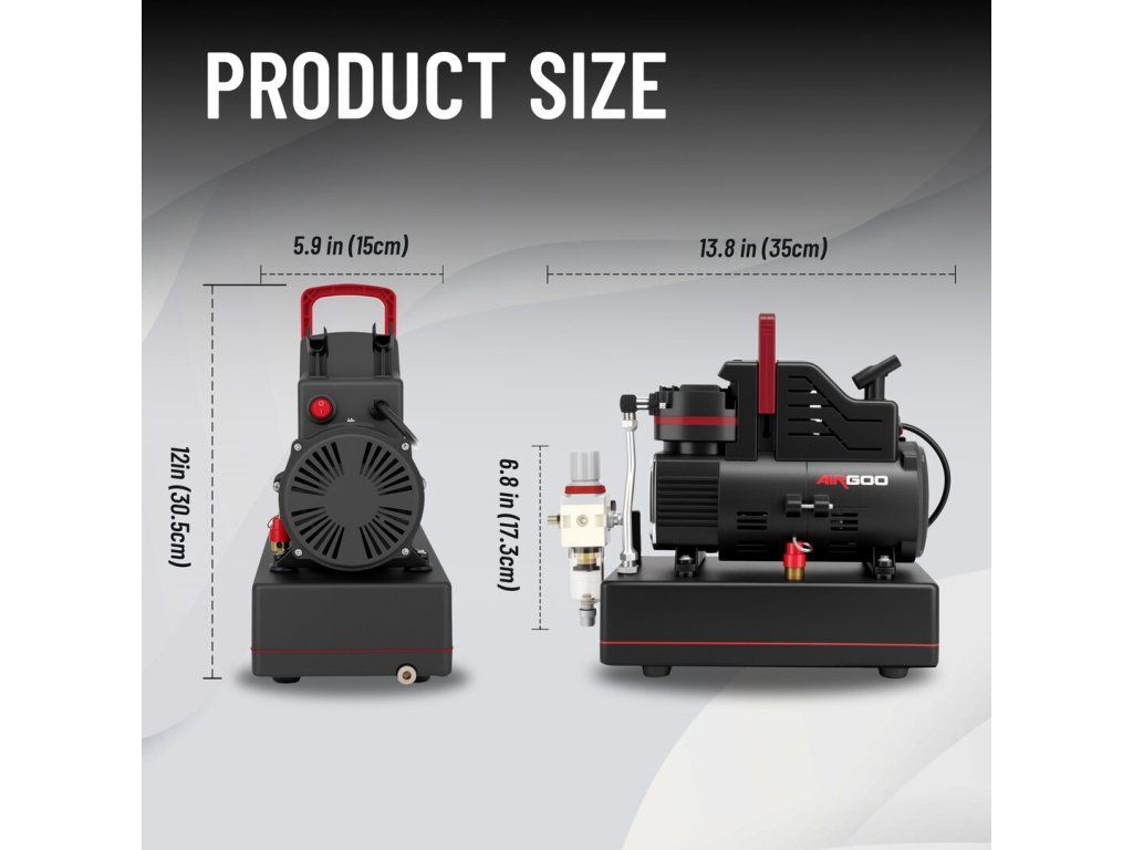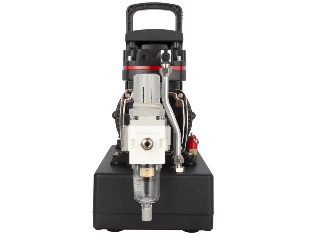 Pístový bezolejový kompresor. S tlakovou nádobou, regulátor výstupního tlaku, který je vybaven filtrem a manometrem. Nízká hlučnost během provozu. Díky nízké hmotnosti je přenosný a vhodný pro domácí a hobby použití. Tento kompresor je vhodný pro airbrush s tryskami 0,2 až 1 mm. Obsahuje dvojité chladící ventilátory umožňují dlouhodobý nepřetržitý provoz.
