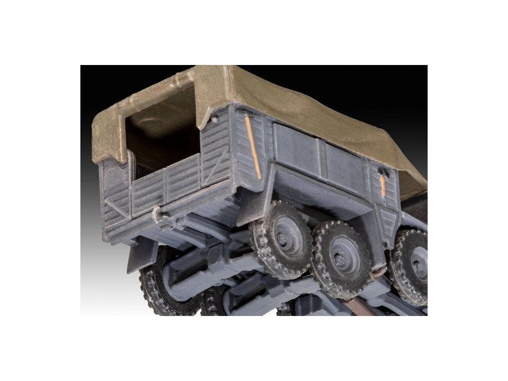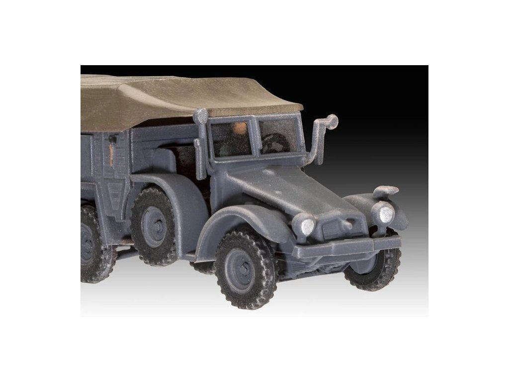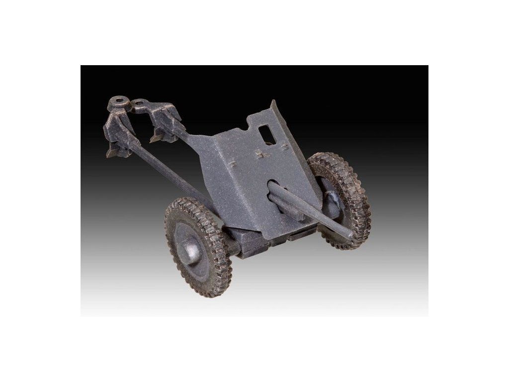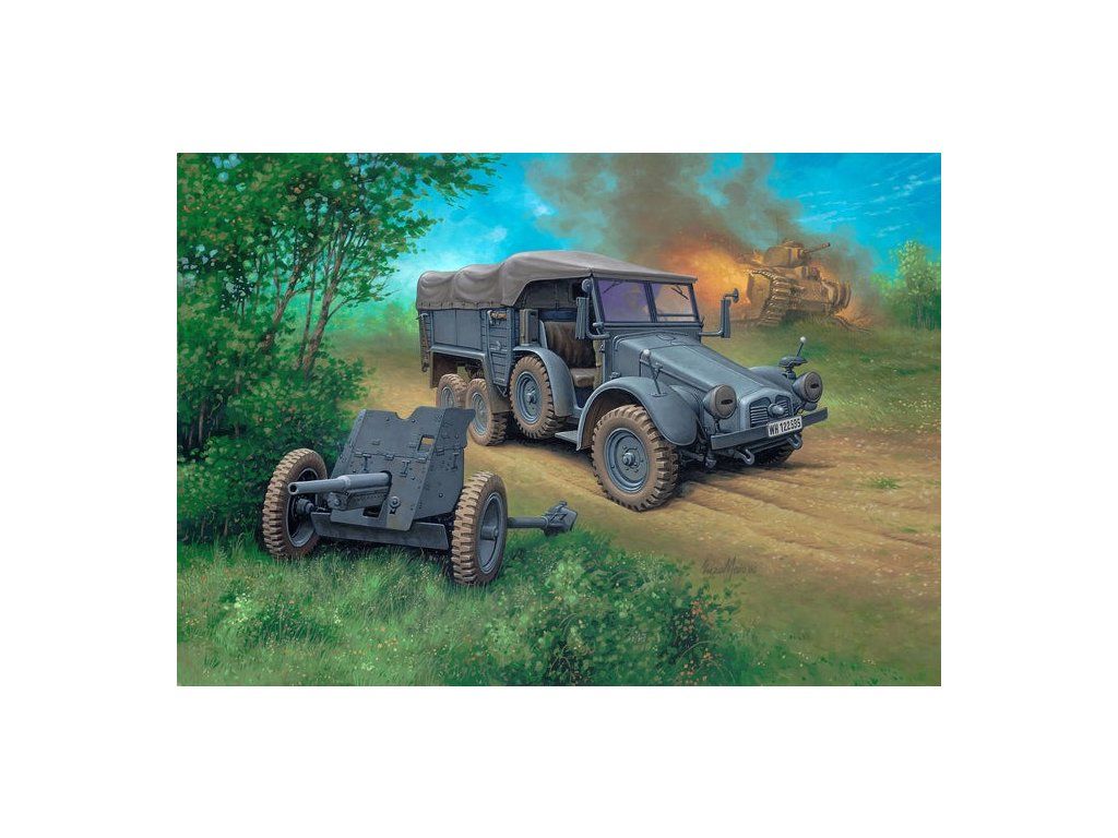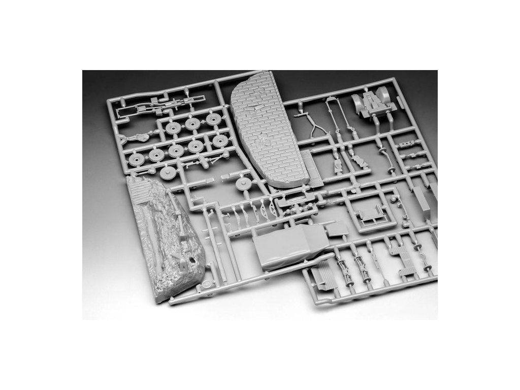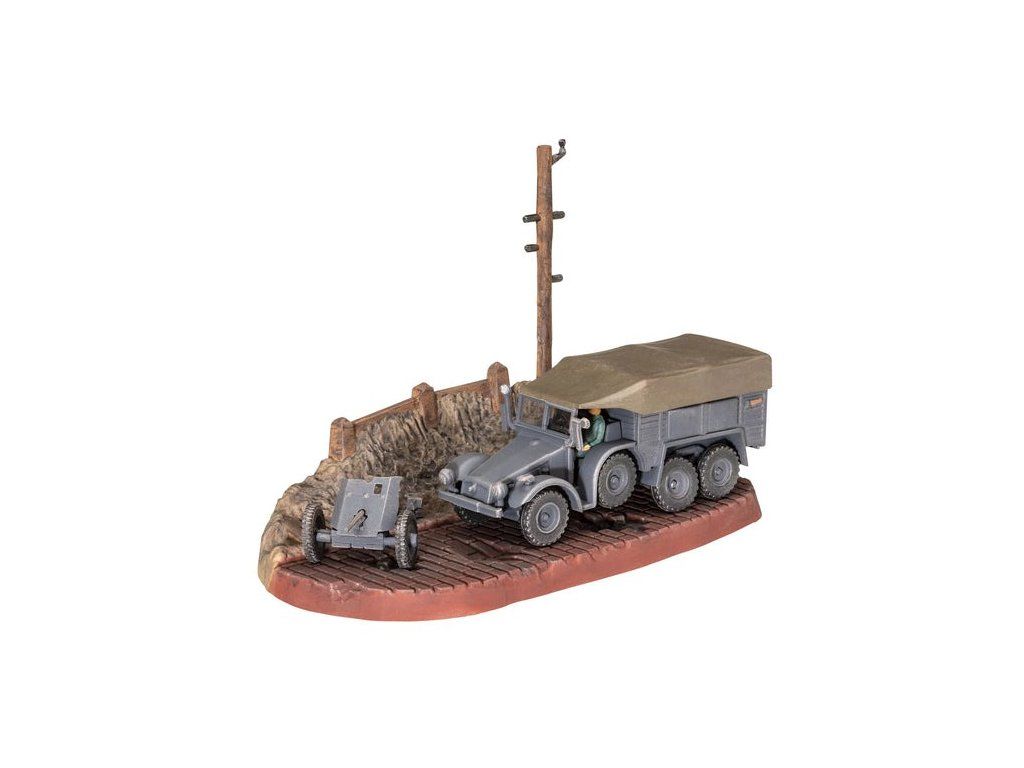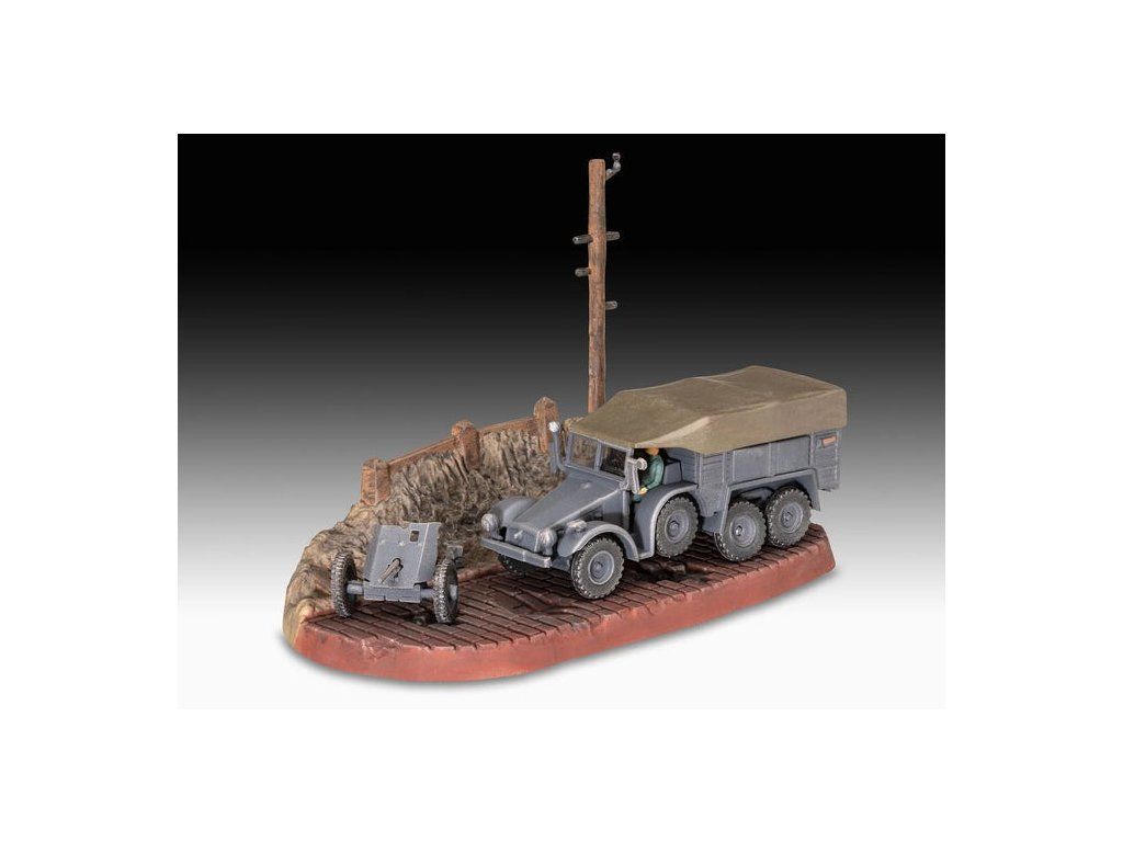 Stavebnice plastikového modelu malé diorámy německého vojenského vozidla a kanónu z druhé světové války. Součástí stavebnice jsou také 3 akrylové barvy, lepidlo a štětec.