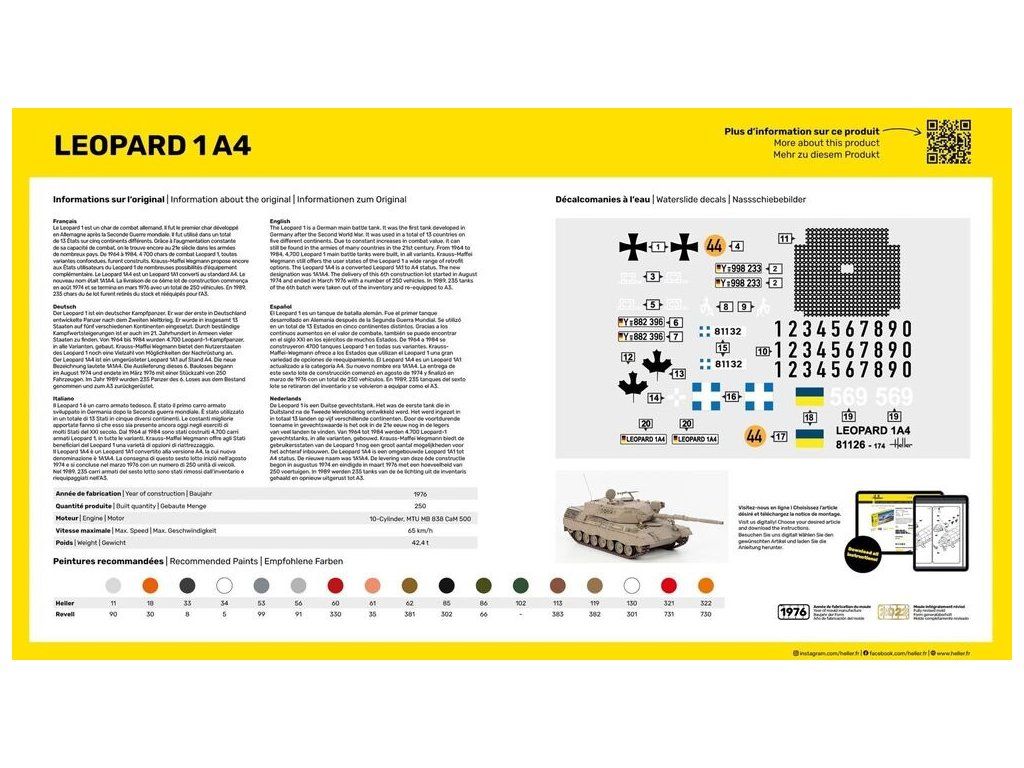 Stavebnice plastikového modelu německého hlavního bojového tanku z 20. století. Stavebnice obsahuje základní barvy, lepidlo a štětec.
