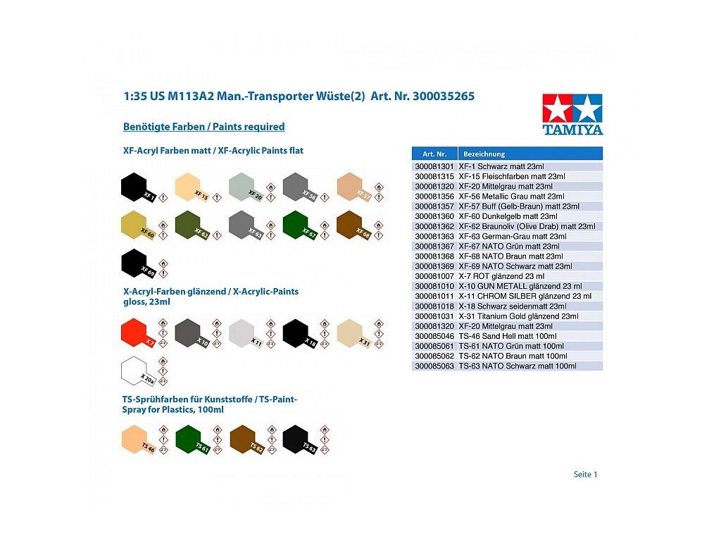 Všeobecné informácie: Stavebnica z plastu, obsahuje nezostavené a nenafarbené diely. V niektorých druhoch stavebníc sú obsiahnuté aj doplnkové kovové, PUR a gumené diely. Pozor, obsahuje drobné diely, udržujte mimo dosahu deti do 3 rokov. Nevhodné pre deti do 14 rokov.