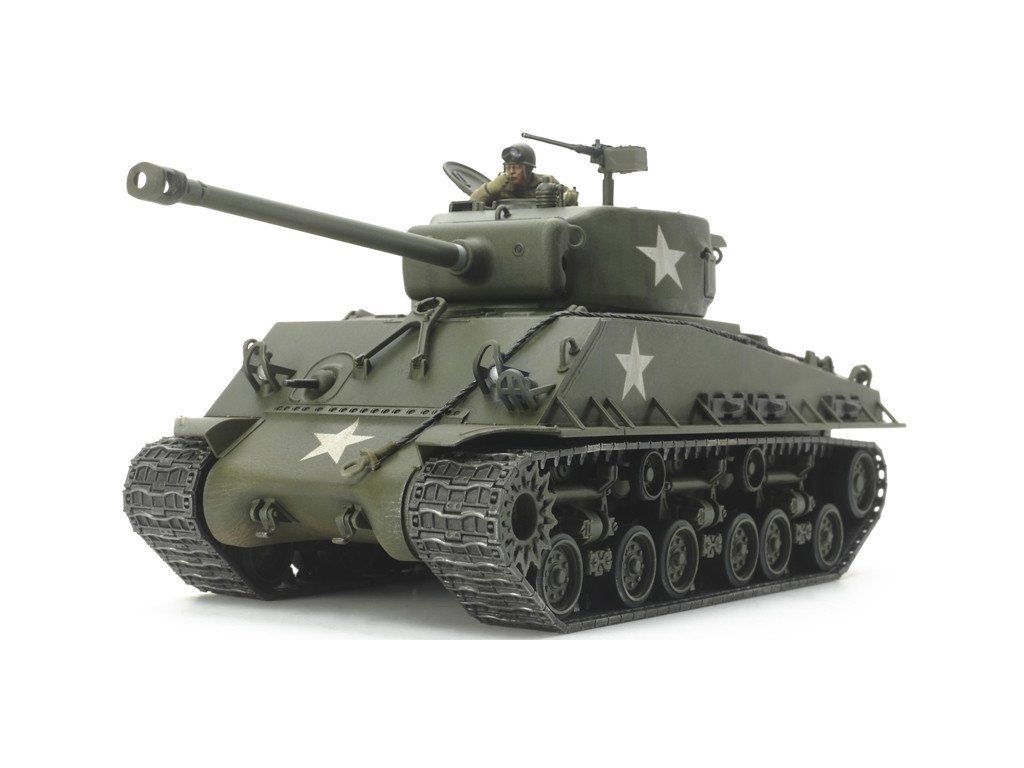 Stavebnice plastikového modelu amerického středního tanku z 2. světové války známého také z filmu Fury. Konstruktéři firmy Tamiya připravili pro tento model zcela novou formu, které předcházelo podrobné studium skutečného tanku, aby bylo dosaženo co největší přesnosti modelu ve všech detailech, včetně specifického povrchu odlévané věže a svařované horní části korby. Plastové pásy jsou tvořeny ucelenými rovnými částmi na obloucích spojovanými jednotlivými články. Ve stavebnici jsou přiložena závaží, která přidávají k modelu i pocit skutečné váhy. Nechybí figurka velitele tanku (od pasu nahoru) a na výběr jsou dvě kamuflážní verze