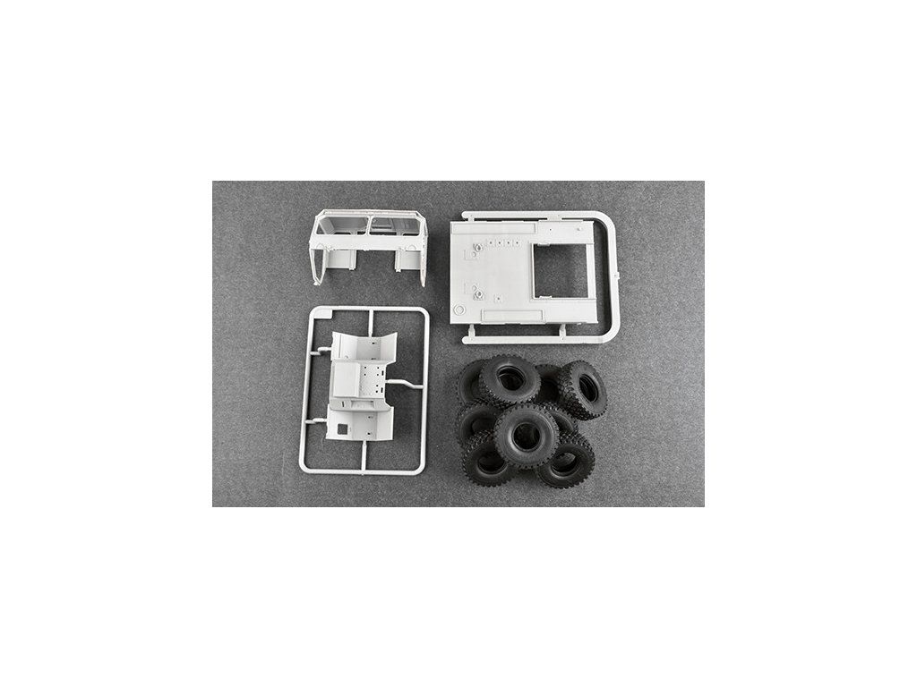 Stavebnica plastového modelu ťažkého taktického vozidla so žeriavom a navijakom.