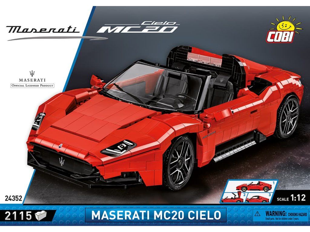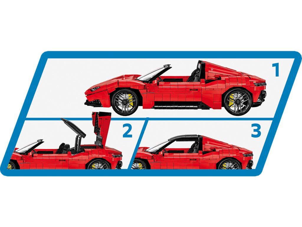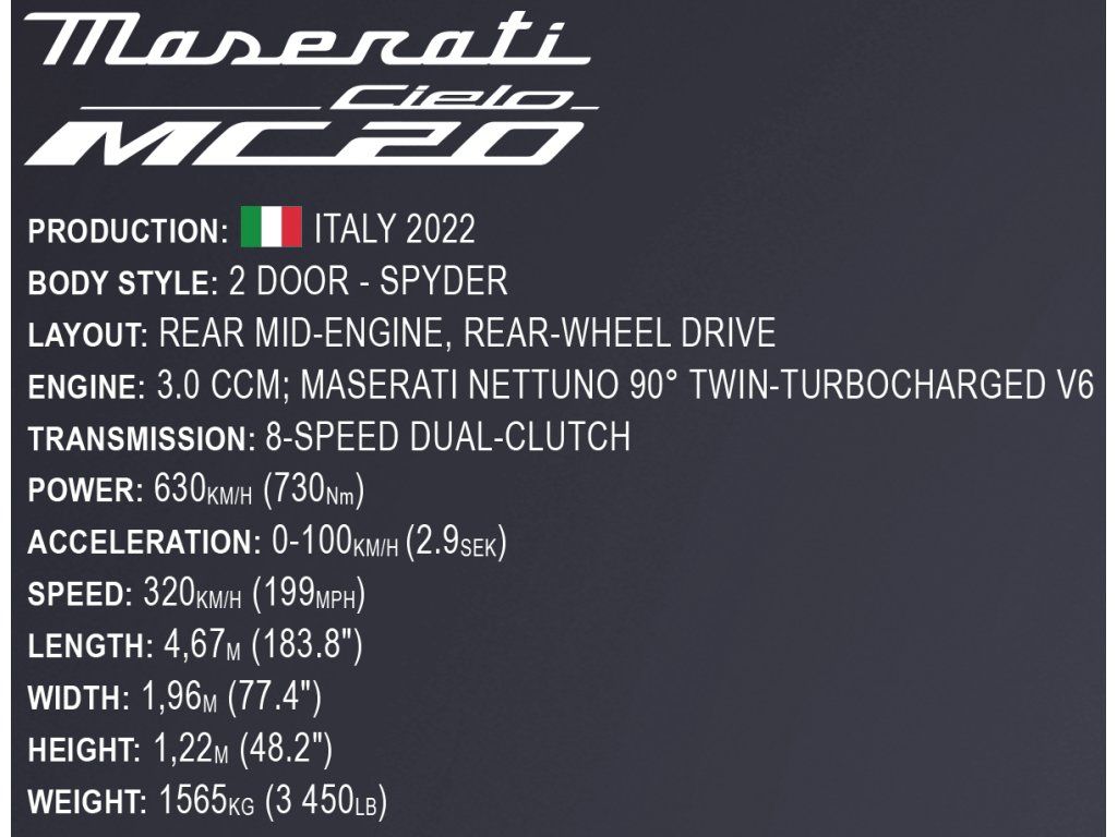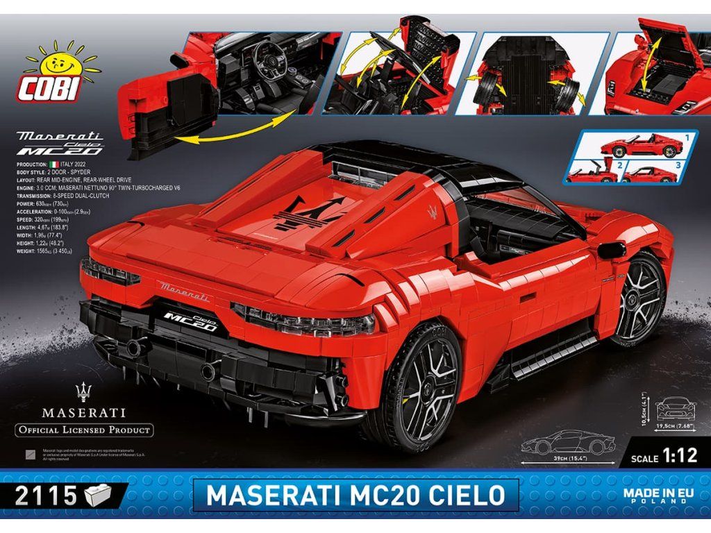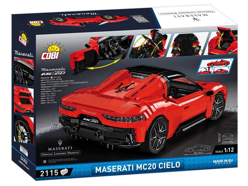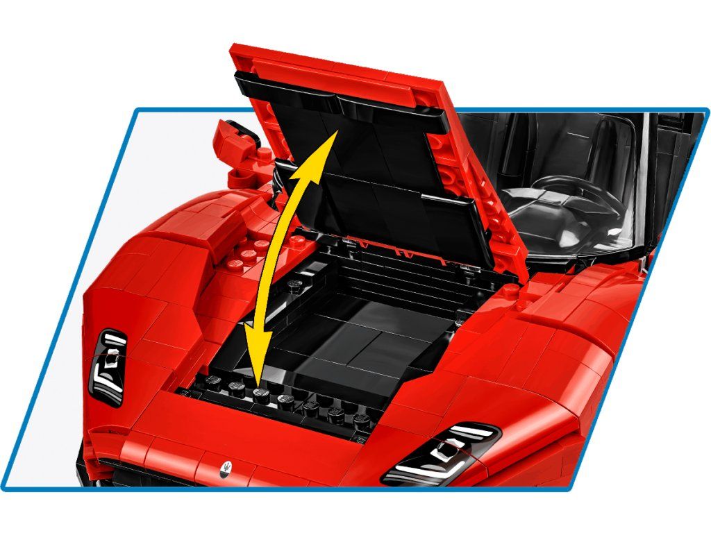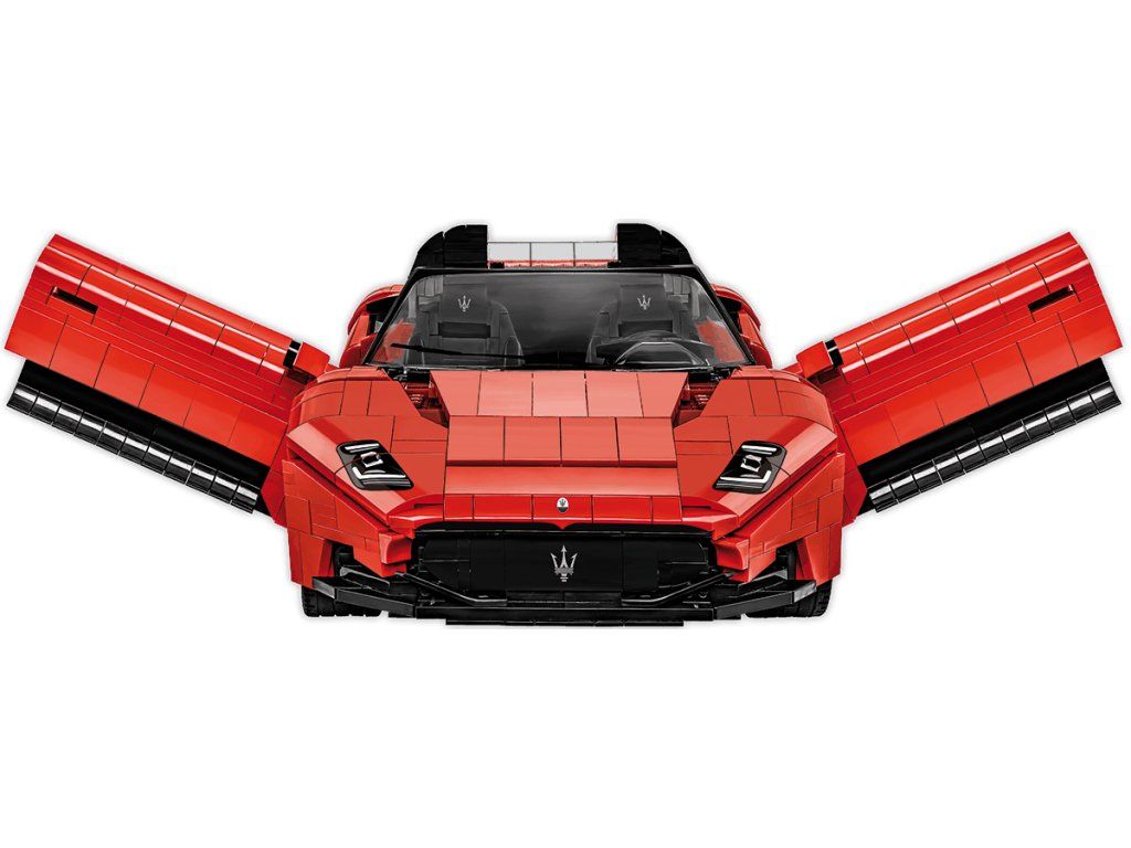 Stavebnice modelu z kostek sportovního vozu Maserati MC20 Cílo v krásné ohnivé červené barvě. Sestavený model má otevírací dveře, otevírací kapotu a dokonce sklápěcí střechu tak, jak je tomu u reálného auta. Přední kola jsou spojena s volantem, kterým lze kola natáčet. Do detailu je proveden interiér vozu včetně přístrojové desky s volantem.