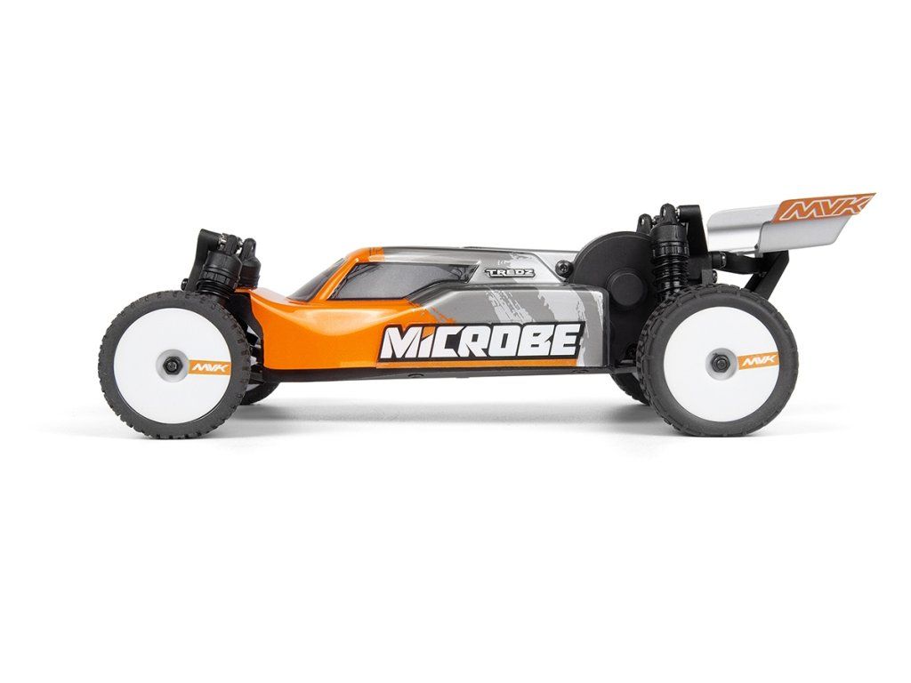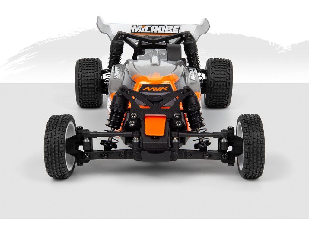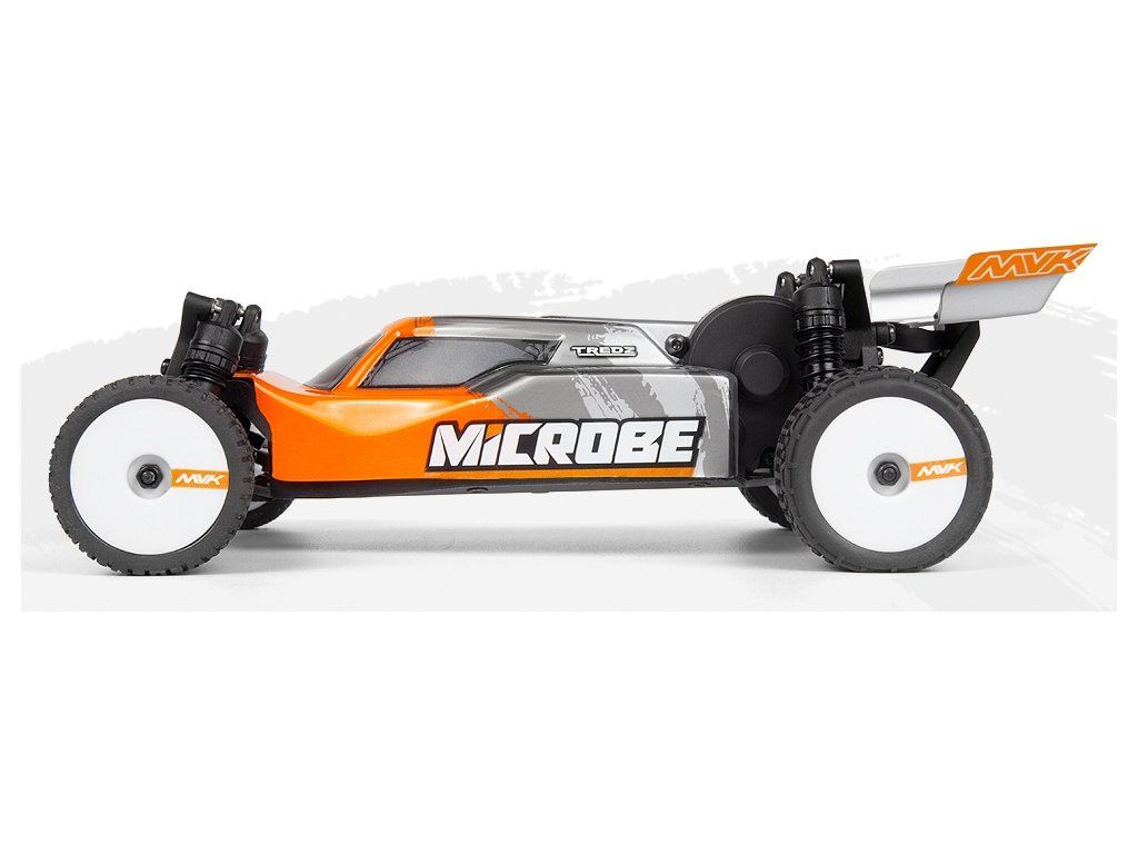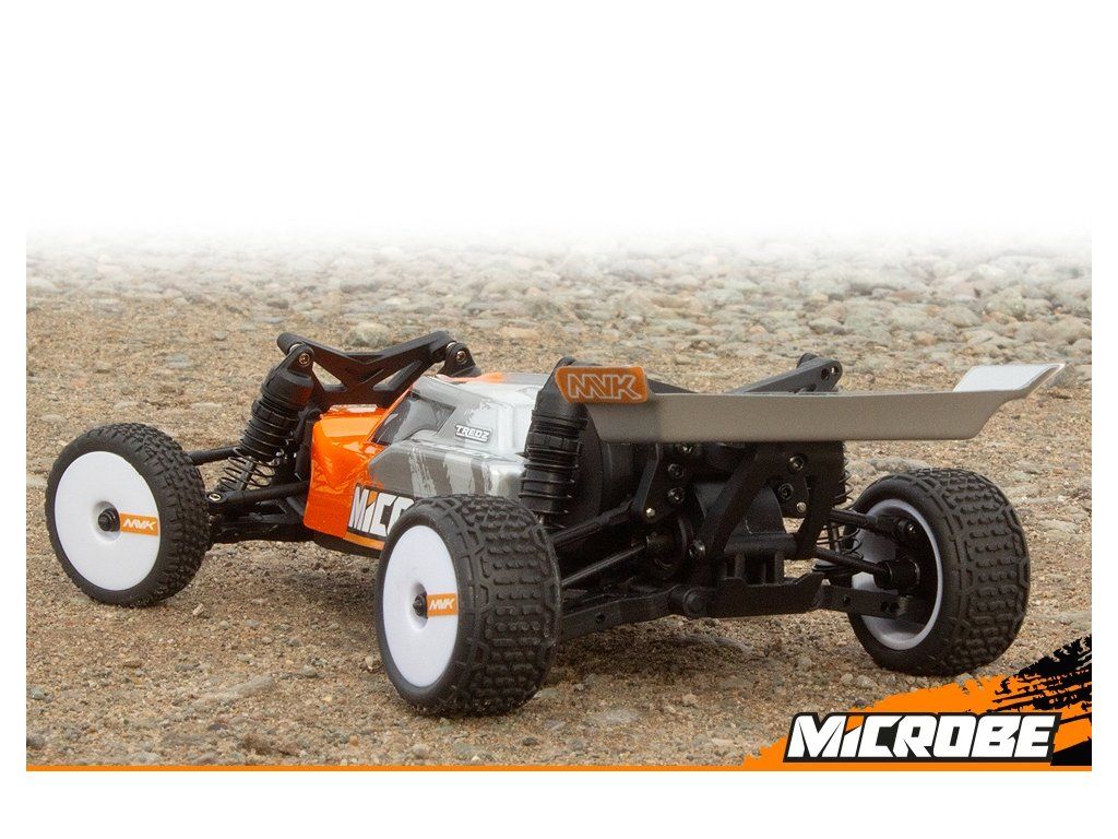 Elegantní 1,5 mm eloxované hliníkové plato podvozku, osazení kuličkovými ložisky a plynulá 3kolová zadní převodovka společně dodávají modelu Microbe stabilní a přesný pocit z jízdy. Přidejte olejové tlumiče a odvětrávaná kola s pěnovými vložkami a získáte malou buggy, která miluje zatáčky, pohlcuje nerovnosti a s jistotou vystřeluje ze zatáček.
