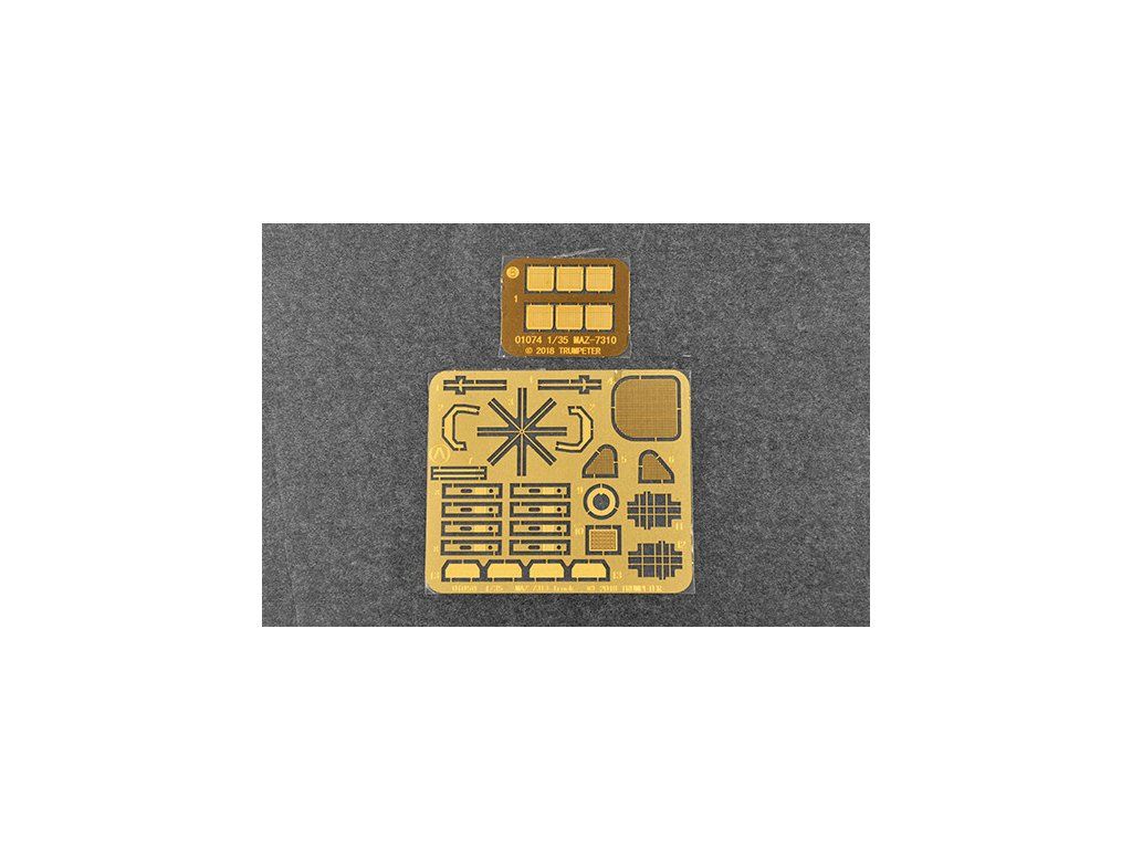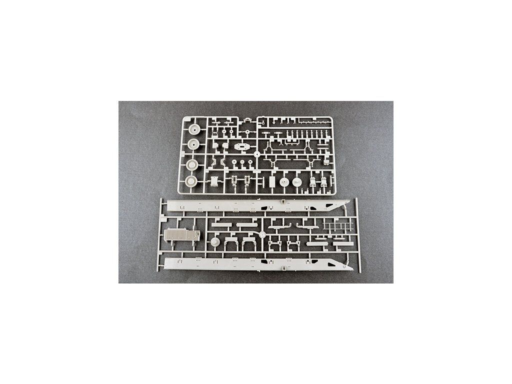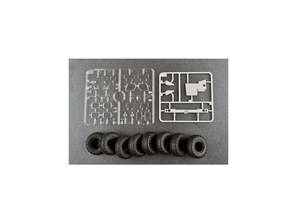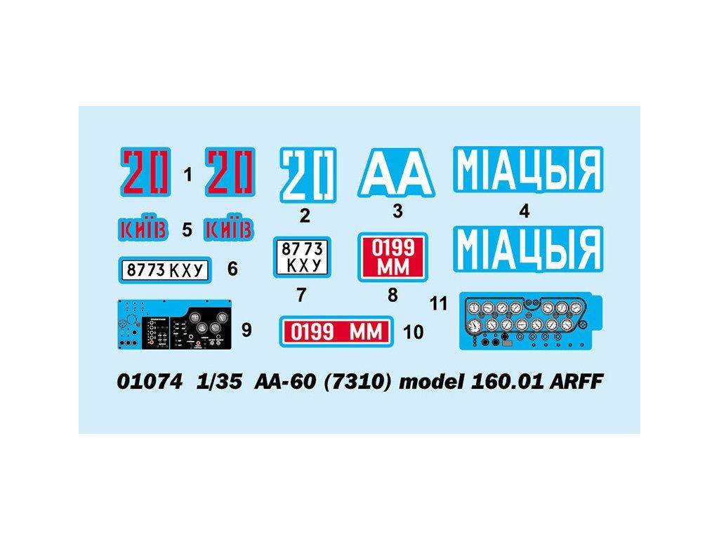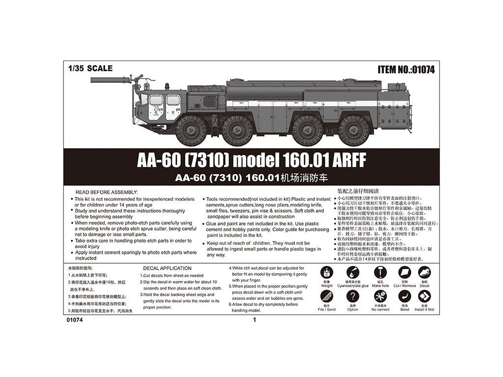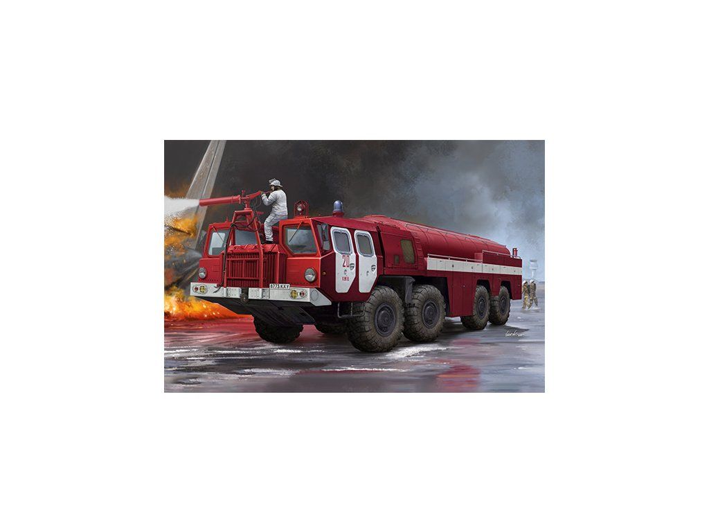 Stavebnice plastikového modelu ruského letištního těžkého hasičského automobilu.Stavebnice obsahuje také kovové fotoleptané díly a gumové pneumatiky.