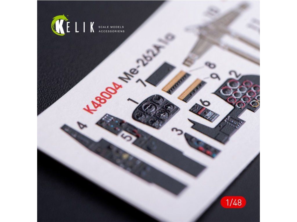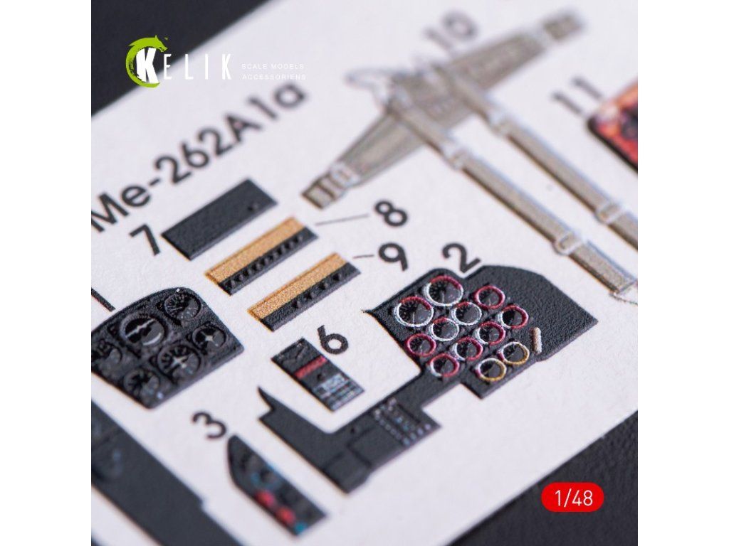 Sada 3D nálepek (dekálů) určená do interiéru letadla Me-262 A1 od firmy Tamiya v měřítku 1/48