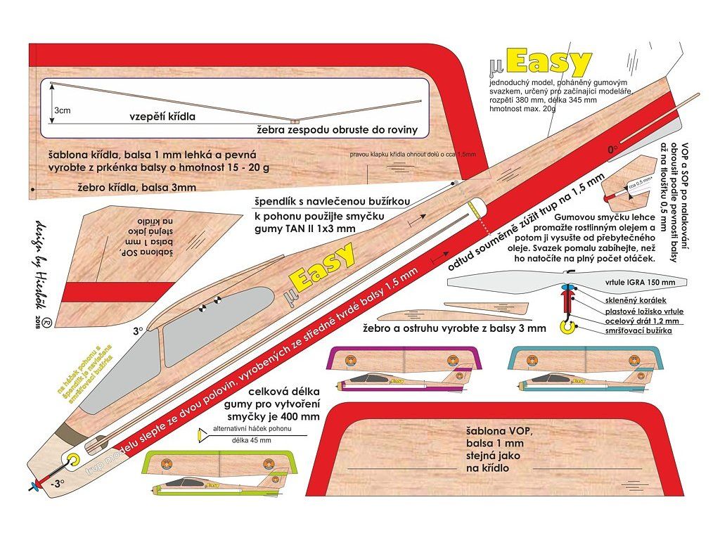 Stavebnice balzového modelu letadla k pohonu gumovým svazkem. Vhodné pro pokročilé modeláře. Stavebnice Micro Easy je určena pro pokročilé modeláře od přibližně 10 let. Model je koncipován jako „vzorový“. To znamená, že budete-li se řídit proporcemi a velikostí ploch, můžete si na jejich základě navrhnout vlastní model, který bude mít podobné letové vlastnosti jako náš vzorový model. Souprava obsahuje podrobný plán modelu.