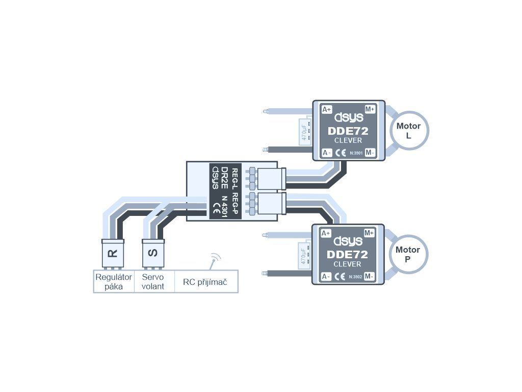 • DR2E směšuje signály kanálu plynu regulátoru (páky) a kanálu směru (volantu, kormidla).
