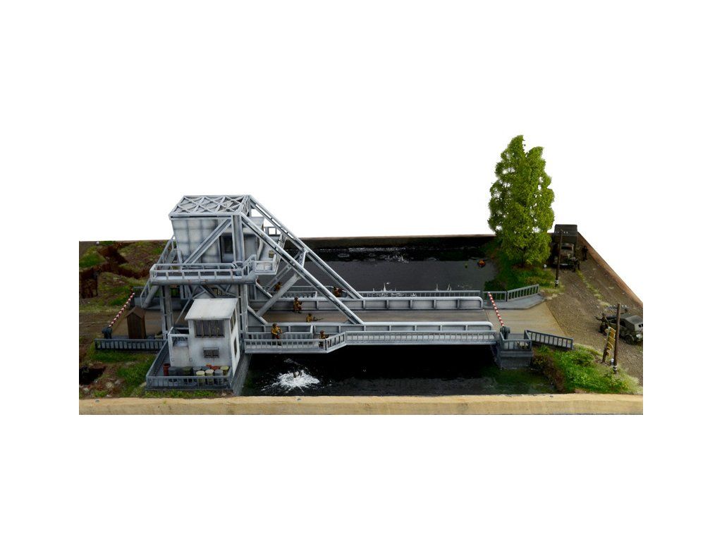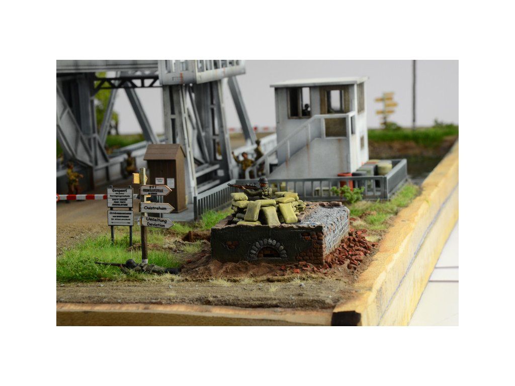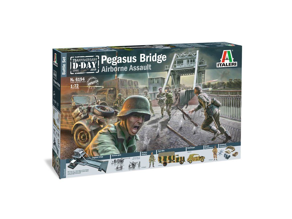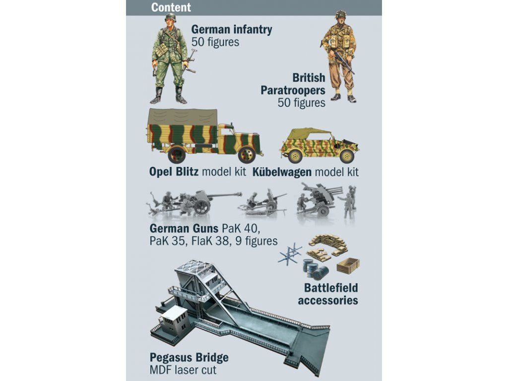 Stavebnice plastikového modelu diorámy znázorňující obsazení mostu Pegasus Bridge britskými vojáky 5. a 6. června 1944 během bojů 2. světové války. Balení obsahuje plastové stavebnice vojenské techniky a figurek, a laserem vypalované díly pro most.