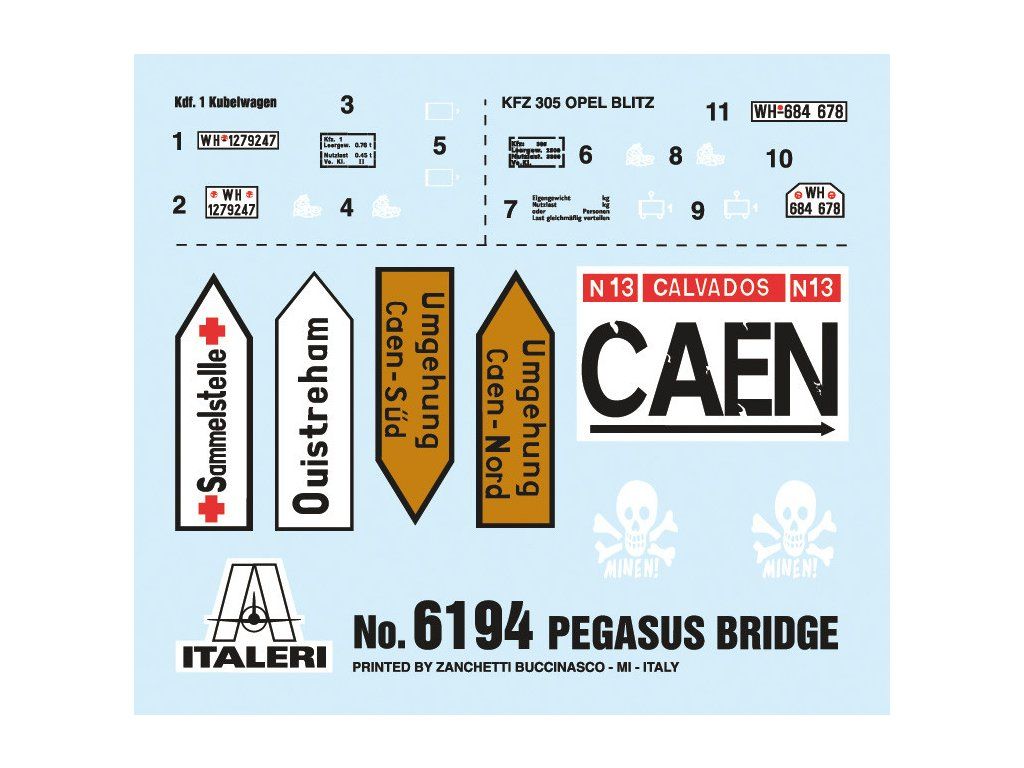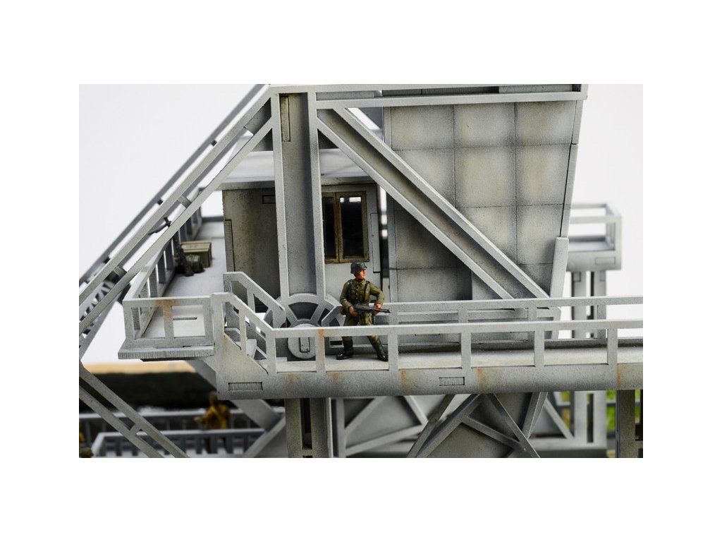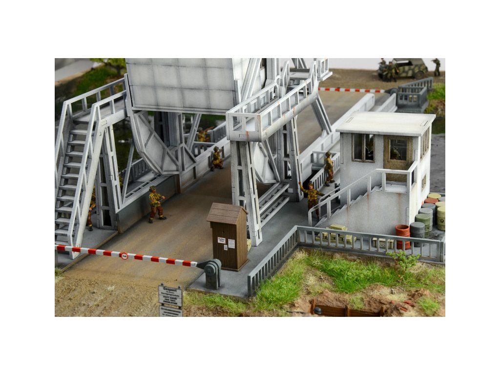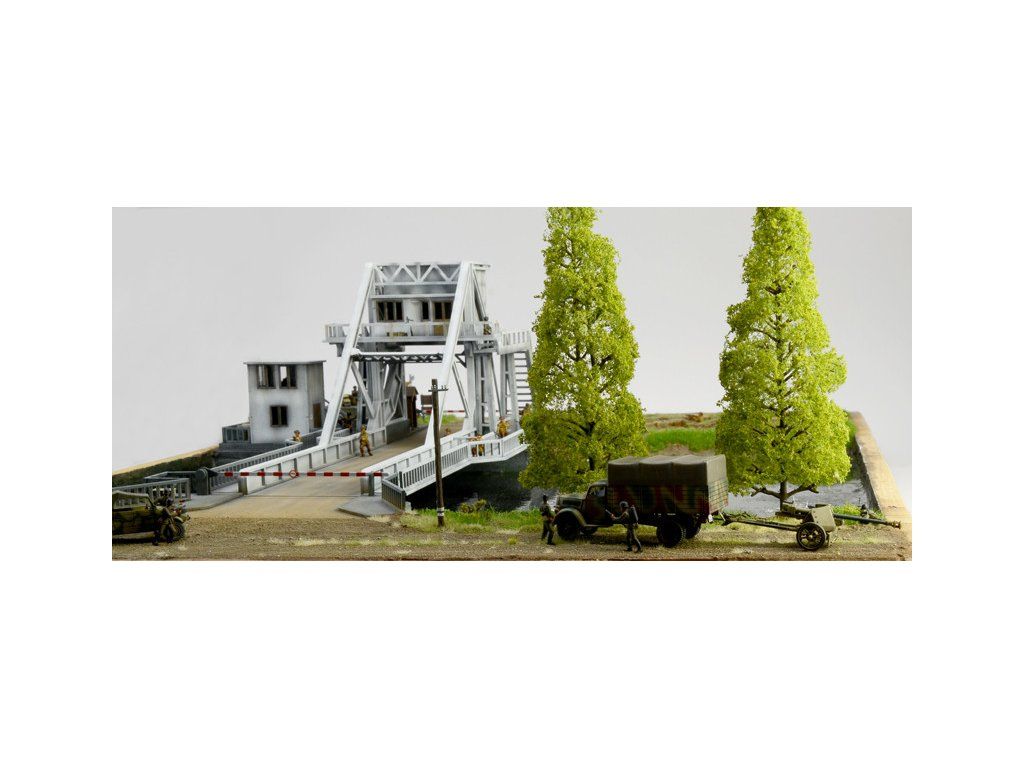 Stavebnice plastikového modelu diorámy znázorňující obsazení mostu Pegasus Bridge britskými vojáky 5. a 6. června 1944 během bojů 2. světové války. Balení obsahuje plastové stavebnice vojenské techniky a figurek, a laserem vypalované díly pro most.