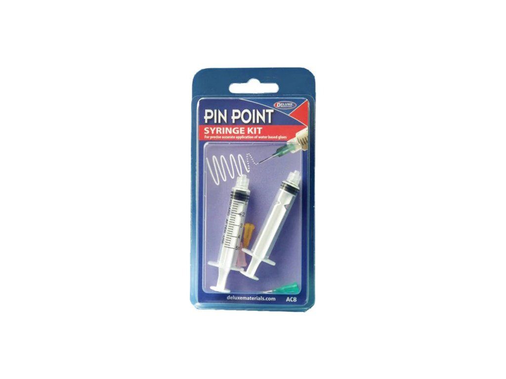 Sada dvou injekčních stříkaček se 3 tlustými nerezovými jehlami slouží pro přesnou aplikaci vodou ředitelných lepidel. Po skončení práce je potřeba vypláchnout stříkačky a jehly vodou.