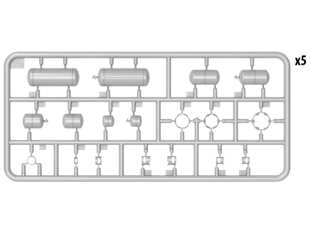 Stavebnica plastových modelov nádob na plyn. Sada obsahuje diely pre 20 nádob v rôznych veľkostiach.