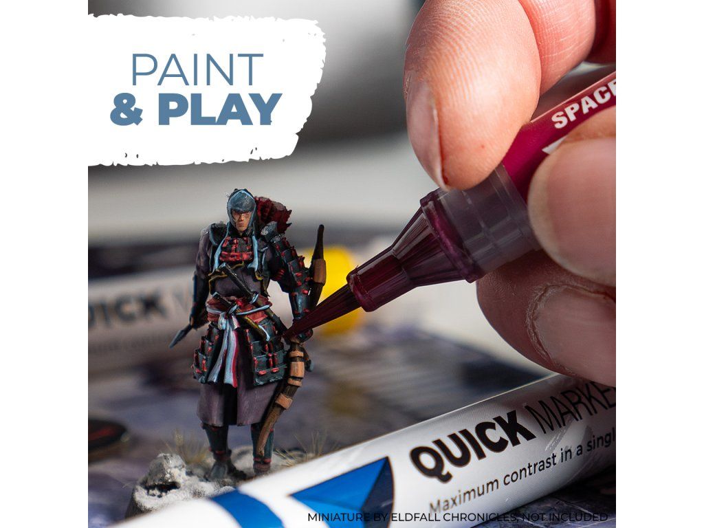 Quickmarkery jsou speciální akrylové barvy, které kombinují štětec a fixu v jednom. Obsahují barvu na vodově-pryskyřičné (resin) bázi, která redukuje množství kroků a technik, které je nutno provést při barvení figurek s tradičními akrylovými barvami (povrchová vrstva barvy, stíny, zvýrazňování) na jeden krok po nanesení základní vrstvy barvy (primeru). Quickmarkery poskytují dokonalou přilnavost k plastovým, pryskyřičným (resin), kovovým nebo dřevěným povrchům. Barvy se mohou jemně lišit intenzitou krytí, ale mohou být aplikovány také v několika vrstvách. Po zaschnutí jsou odolné vůči vodě, teplu, patinovacím přípravkům a lakům, takže můžete pracovat bez obav z odstranění nebo poškození povrchové vrstvy barvy. Quickmarkery se skvěle hodí pro malování figurek a plastových modelů. Umožňují vytváření jemných linek i barvení větších ploch modelu.