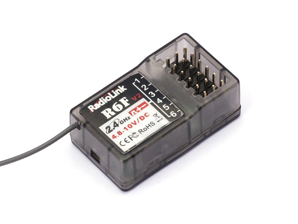 Radiolink R6F 2,4GHz je 6-kanálový přijímač FHSS s frekvenčním přeskokem kompatibilní s vysílači Radiolink pro RC auta RC4GS, RC6GS a vysílači pro letadla T8FB a T8S. Může pracovat se servy se standardním napájením i s „vysokonapěťovými“ (HV) servy.Přijímač je vhodný pro RC auta, tanky a jinou pozemní techniku a RC lodě (výrobcem udávaný dosah je až 400 m na zemi).