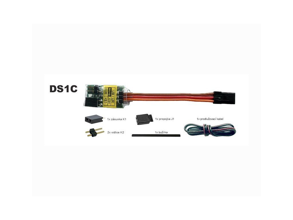 Obsah dodávky: DS1C (SW 1.1), návod na použitie, 1x zásuvka K1, 2x vidlica K2, 1x prepojka J1, bužírka, dvojžilový kábel.