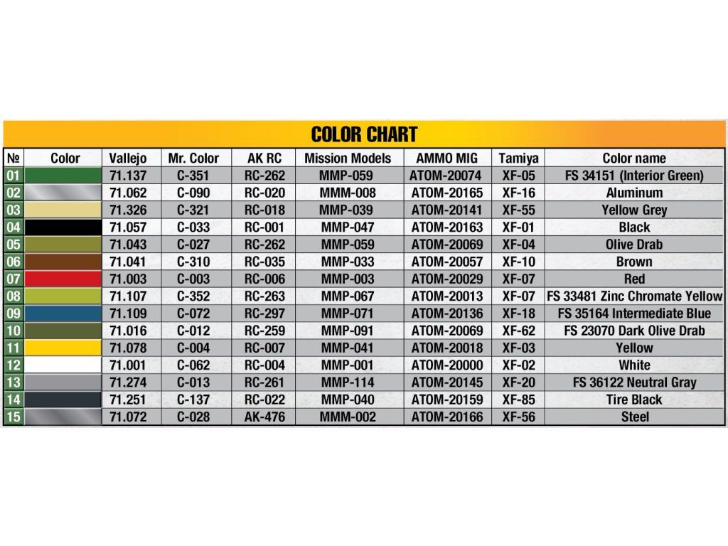 K sestavení modelu je třeba zakoupit: Lepidlo na plasty, barvy, štětce, modelářské nářadí. Dárkové sady / sady modelů mohou obsahovat také základní barvy, lepidlo a štětec.