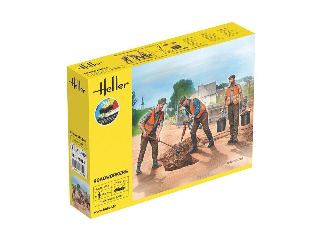 Stavebnice plastikového modelu sady figurek silničních dělníků vhodný pro použití např. v diorámu. Součástí balení jsou díly na 3 figurky a také pracovní vybavení jako sbíječka, lopata a vědra. Součástí stavebnice jsou také základní odstíny barev, lepidlo a štětec.