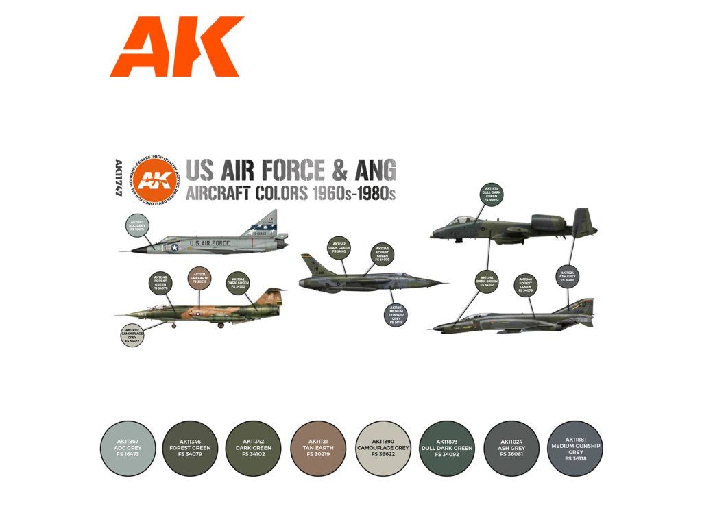 Sada akrylových barev AK-Interactive 3. generace vhodných pro stříkání airbrushem nebo malování štětcem. Sada je vhodná pro namalování ale nastříkání amerických letadel ve službách US Air Force a Air National Guard.