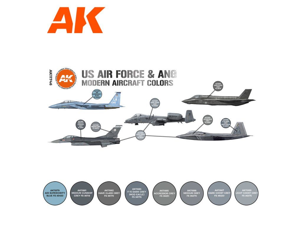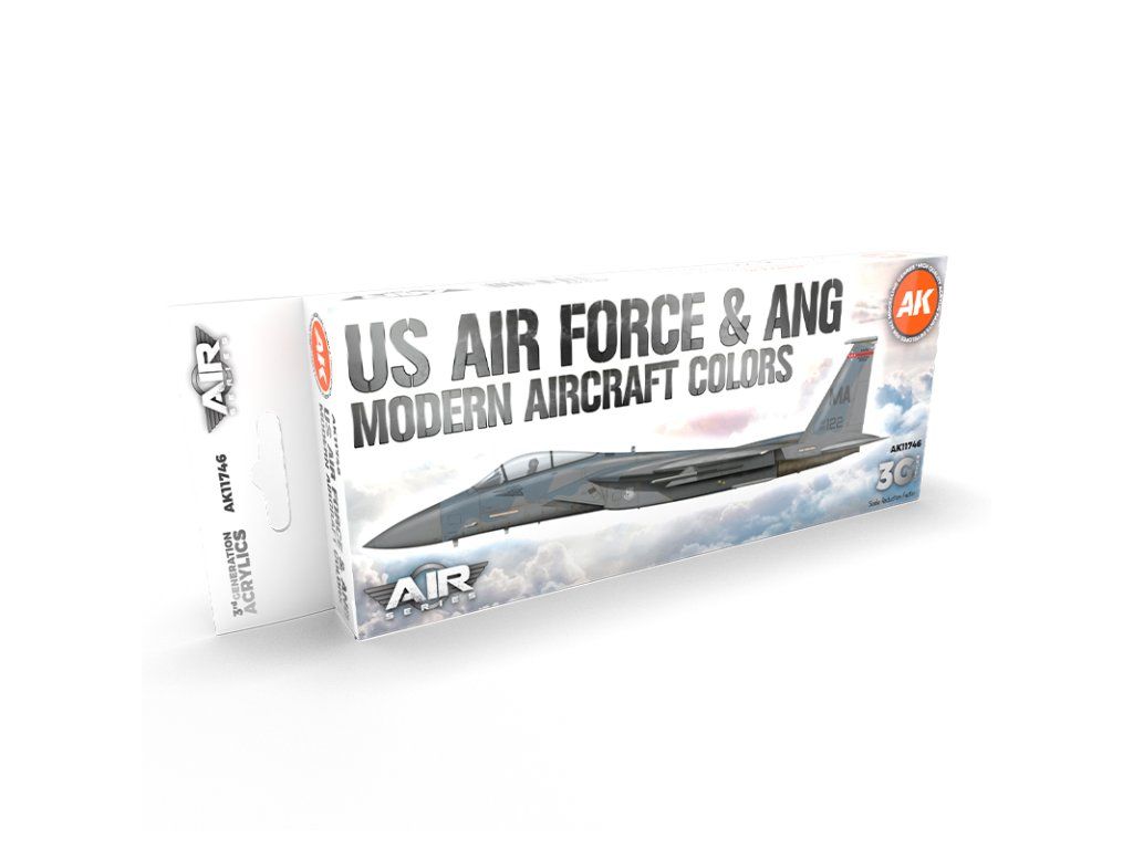 Sada akrylových barev AK-Interactive 3. generace vhodných pro stříkání airbrushem nebo malování štětcem. Sada je vhodná pro namalování ale nastříkání amerických letadel ve službách US Air Force a Air National Guard.