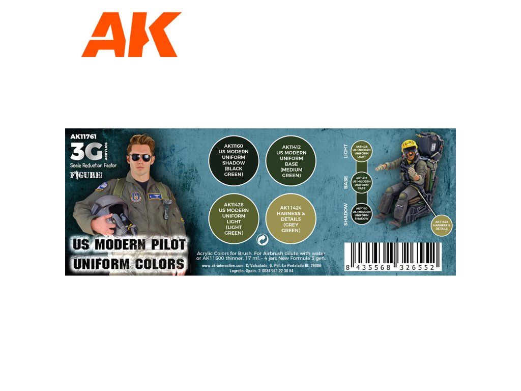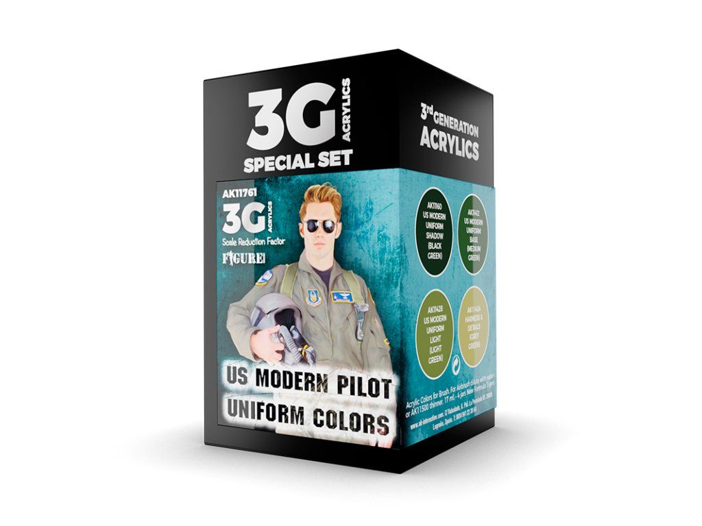 Sada akrylových barev AK-Interactive 3. generace vhodných pro stříkání airbrushem nebo malování štětcem. Sada je vhodná pro namalování ale nastříkání figurek moderních amerických pilotů.
