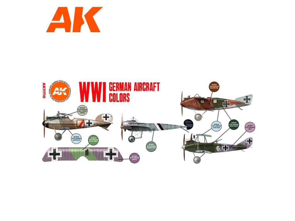 Sada akrylových barev AK-Interactive 3. generace vhodných pro stříkání airbrushem nebo malování štětcem. Sada je vhodná k namalování ale nastříkání letadel používaných německou armádou během první světové války.