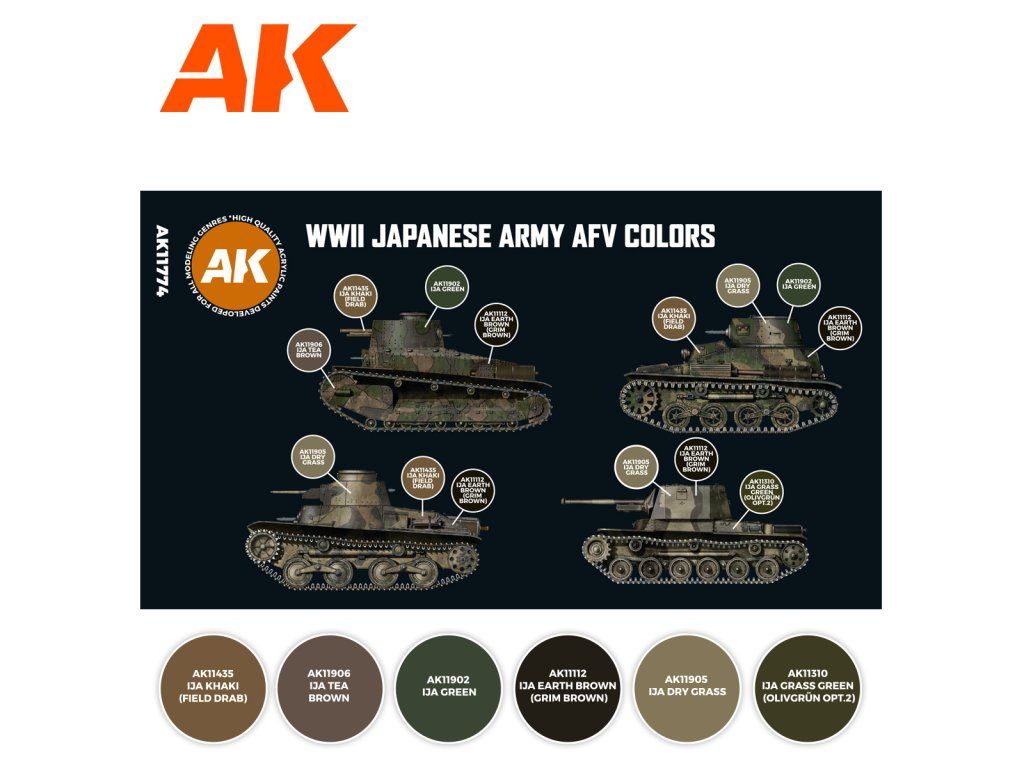 Sada akrylových barev AK-Interactive 3. generace vhodných pro stříkání airbrushem nebo malování štětcem. Sada je vhodná k namalování ale nastříkání obrněných vozů japonské armády používaných během 30. let a druhé světové války.