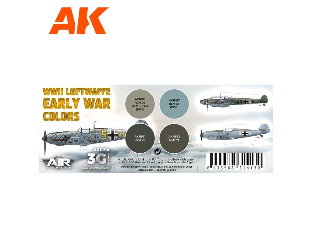 Sada akrylových barev AK-Interactive 3. generace vhodných pro stříkání airbrushem nebo malování štětcem. Sada je vhodná k namalování ale nastříkání německých letadel z počátečních fází druhé světové války.